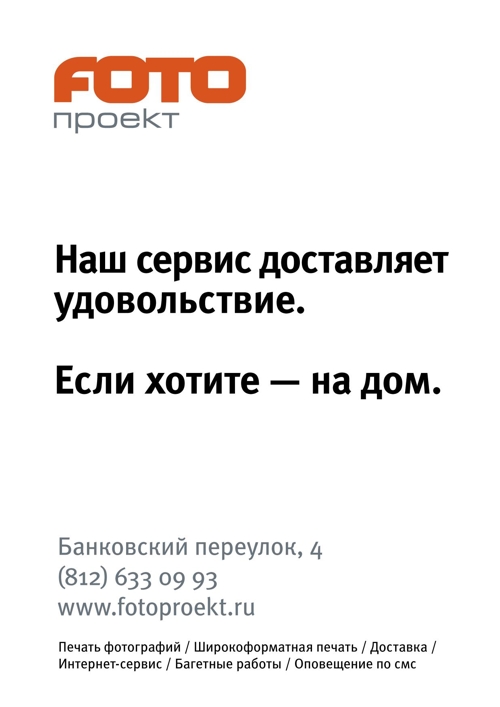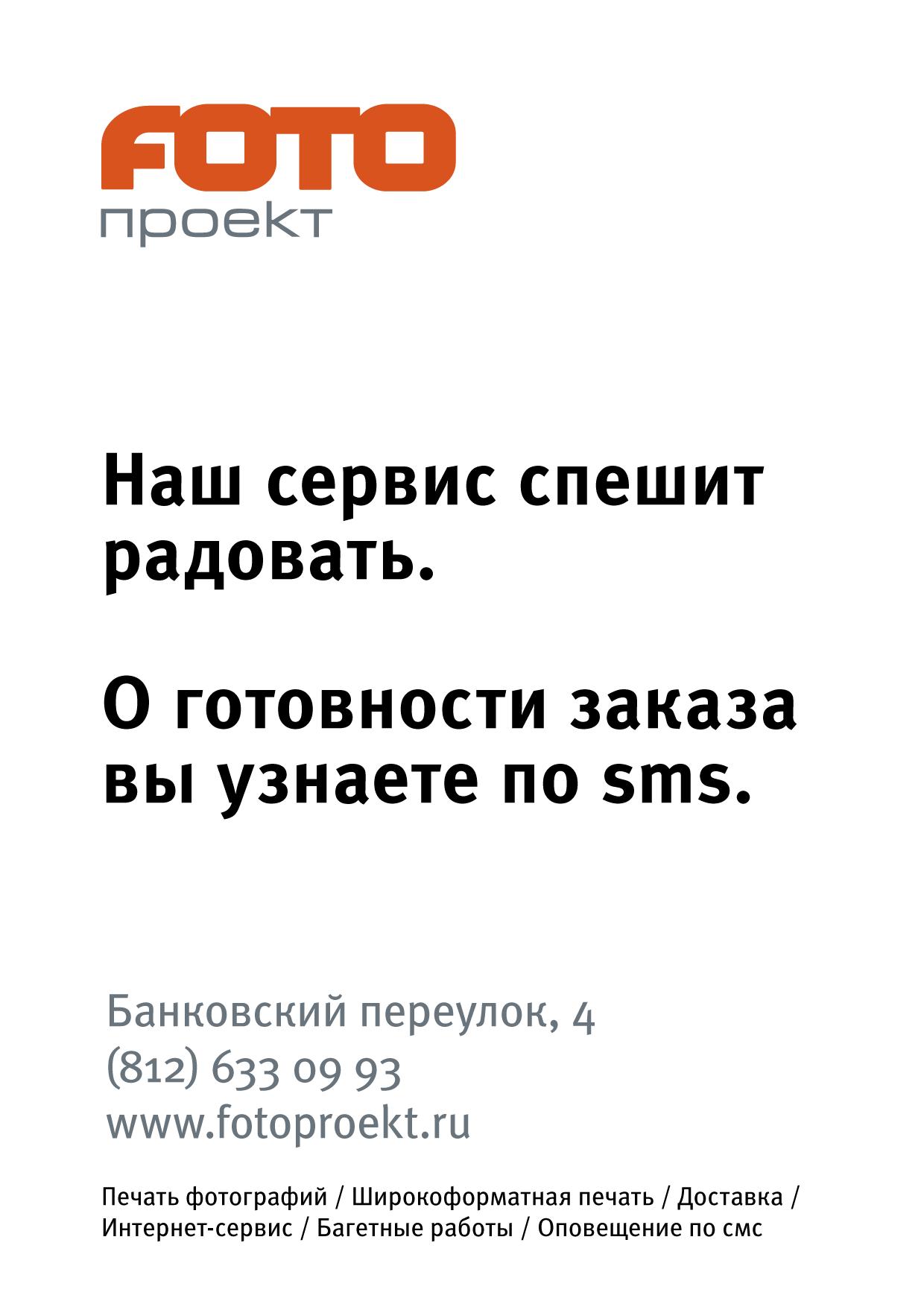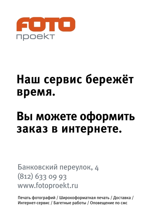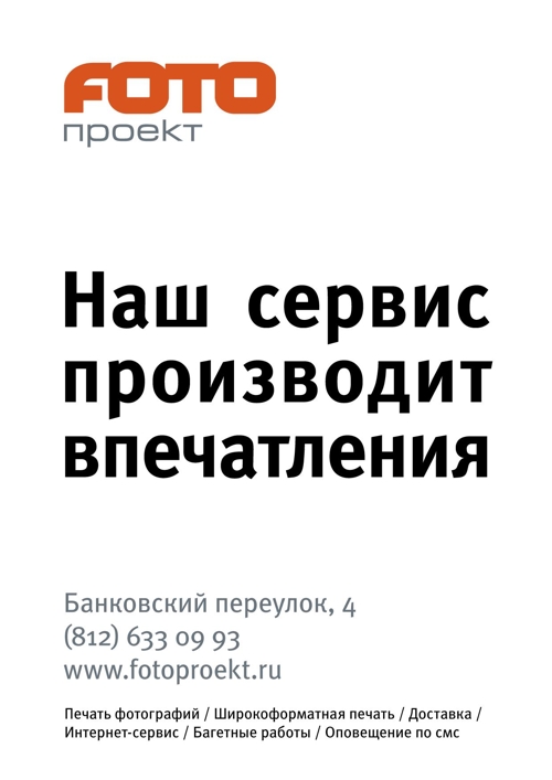 Сервис "Фотопроекта" - настоящий предмет гордости. Каждый год пополняясь новыми услугами, он остаётся понятным и удобным каждому клиенту. Хотите распечатать фотографии или сделать персональную фотокнигу, оформить работу в багет или отсканировать плёнку - помимо качественного результата вы получите внимание и уважение к вашему времени.
