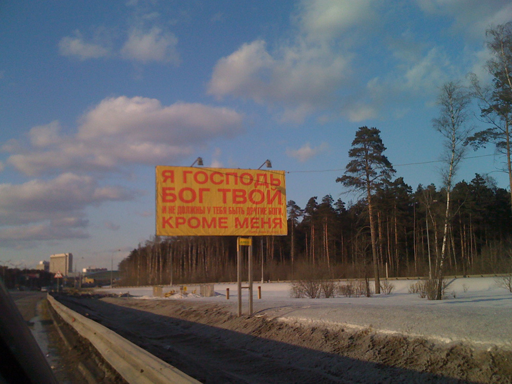 Малый бизнес замаливает грехиЩиты с цитатами из Библии, появившиеся в Москве, начали привлекать внимание интернет-сообщества. Евгений Матвеев, автор ресурса gloomreklama.ru, увидел щит сразу за развязкой "Мега Белая Дача", на внешнем радиусе, и сфотографировал его на свой iPhone.