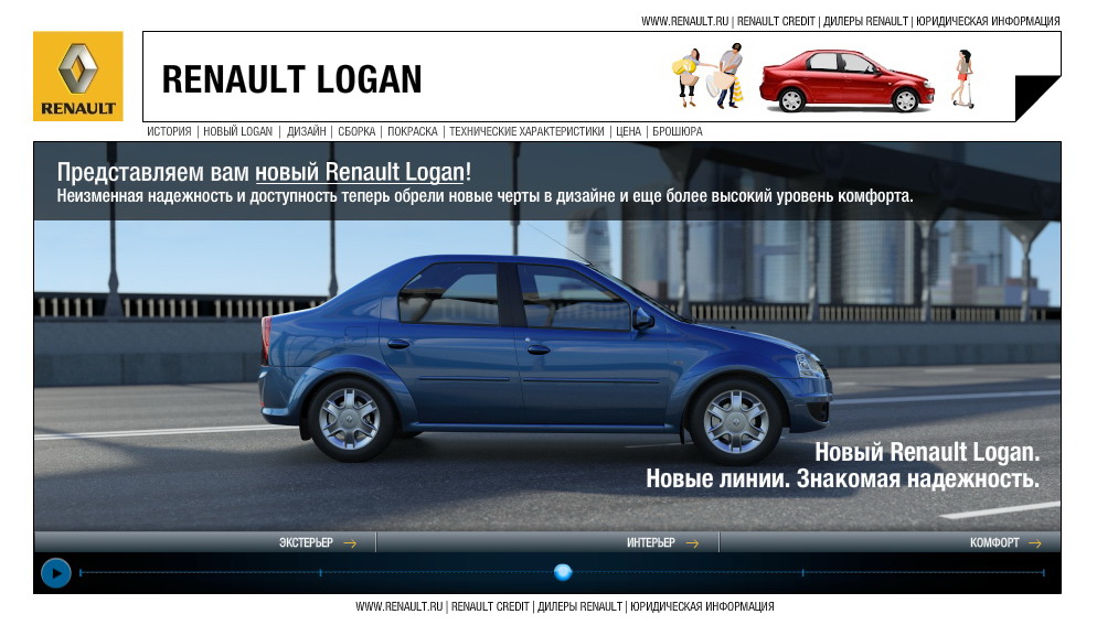Renault Logan предлагает знакомиться на сайте10 марта 2010 года компания Renault совместно с креативными агентствами Publicis United и Publicis Modem запустили сайт для презентации обновленного Renault Logan.Сайт стал продолжением масштабной рекламной кампании, стартовавшей в феврале 2010 года. Оригинальный 3D-сайт - это не адаптация глобальных разработок, а локальный продукт, созданный от начала до конца российским агентством цифровых коммуникаций Publicis Modem, которое входит в структуру Publicis United. Рекламная кампания нового автомобиля идет под слоганом "Renault Logan. Новые линии. Знакомая надежность". Нестандартный онлайн-инструмент - эффект морфинга - подчеркивает характер и технологии Renault Logan. Визуальный эффект морфинга наилучшим образом позволяет показать преобразование автомобиля: происходит переход от одного изображения к другому, 3D-модель предыдущей версии плавно перетекает в 3D-форму нового Logan. Трехмерная графика сайта создает эффект присутствия, и любой желающий, запустив ту или иную функцию, может узнать все об обновленном Renault Logan. Несмотря на то что сайт посвящен одной модели автомобиля, он многофункционален и содержит максимальный объем информации, которая может быть полезна и интересна покупателю: детальное описание и иллюстрации автомобиля, подробные технические характеристики, цены на Renault Logan и многое другое. Состав команды Renault Руководитель службы маркетинговых коммуникаций: Андрей Григорьев Менеджер интернет-проектов: Людмила Яблонская BTL-менеджер: Полина Игнатьева Publicis United Исполнительный креативный директор: Юджин Радевич (Eugene Radewych) Директор по работе с клиентами: Алена Горленко Старший BTL-менеджер: Елена Лагутина Publicis Modem Креативный директор: Кирилл Соловьев Директор проектов: Дмитрий Мысков Арт-директор: Влад Сергеев Flash-аниматор: Анна Гросс Копирайтер: Елена Зеликович Программисты: Никита Мудрый, Александр Корнеев |