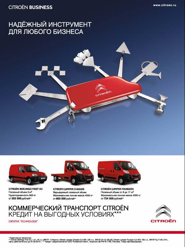 Euro RSCG Russia: автомобиль как бизнес-решениеCitroёn начал новую национальную рекламную кампанию с целью увеличить продажи автомобилей.В марте 2010 года она стартовала в деловой и специализированной прессе. Специальная программа Citroёn Business должна ознакомить потребителей с полным комплексом услуг по продаже и обслуживанию коммерческих автомобилей марки. Основная задача кампании - заявить о широком модельном ряде коммерческих автомобилей, как об эффективном бизнес решении. Citroёn предоставляет возможность подобрать автомобиль, идеально отвечающий самым разным потребностям. Креативная идея была разработана Euro RSCG Russia, московским офисом международной рекламной сети Euro RSCG Worldwide, которая сотрудничает с маркой Citroёn во многих странах мира. "Мы искали сильный визуальный образ, который был бы для всех безоговорочным символом универсальности и надежности и в результате остановили свой выбор швейцарском армейском ноже. Это прямая и четкая аллегория, которая отражает ключевое коммуникационное сообщение: Citroёn Business - надежный инструмент для любого бизнеса", - комментирует Сергей Рожнев, директор группы по работе с клиентами Euro RSCG Russia. В дополнение к имиджевой части макета, потребителю дается возможность ознакомиться с технической информацией, позволяющей оценить высокий уровень оснащенности и доступность коммерческих автомобилей Citroёn. Состав творческой группы Команда Citroёn: Серж Монтье - директор по маркетингу Citroёn Россия Юлия Говорина - руководитель отдела рекламы Citroёn Россия Команда Euro RSCG Russia Наталья Романенко - генеральный директор Сергей Рожнев - директор группы по работе с клиентами Елизавета Бушуева - старший менеджер по работе с клиентами Иван Гриднев - копирайтер Вячеслав Гаврилов - арт директор. |