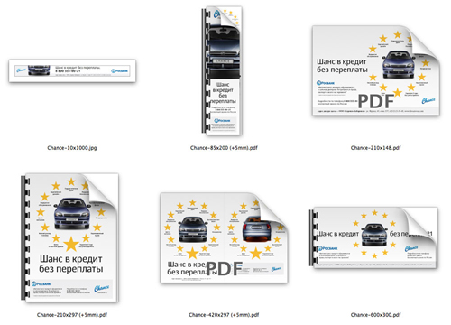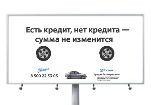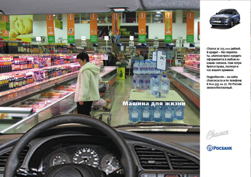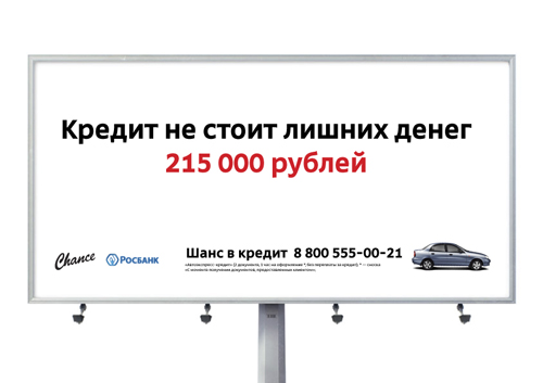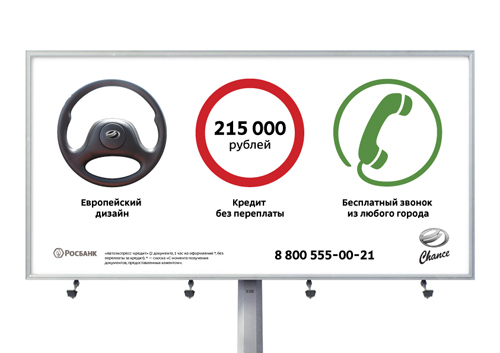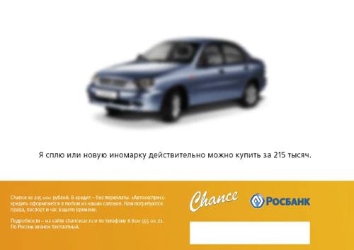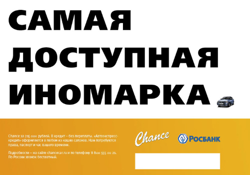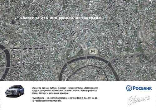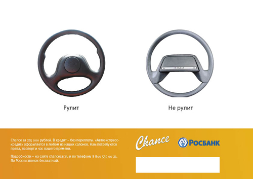 В конце марта Студия Артемия Лебедева завершила работу над разработкой концепции для рекламы выгодных условий кредита на автомобили "Шанс" от "Росбанка".