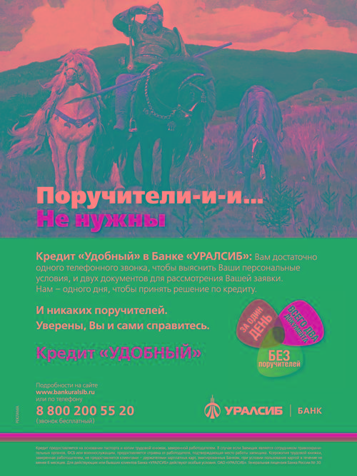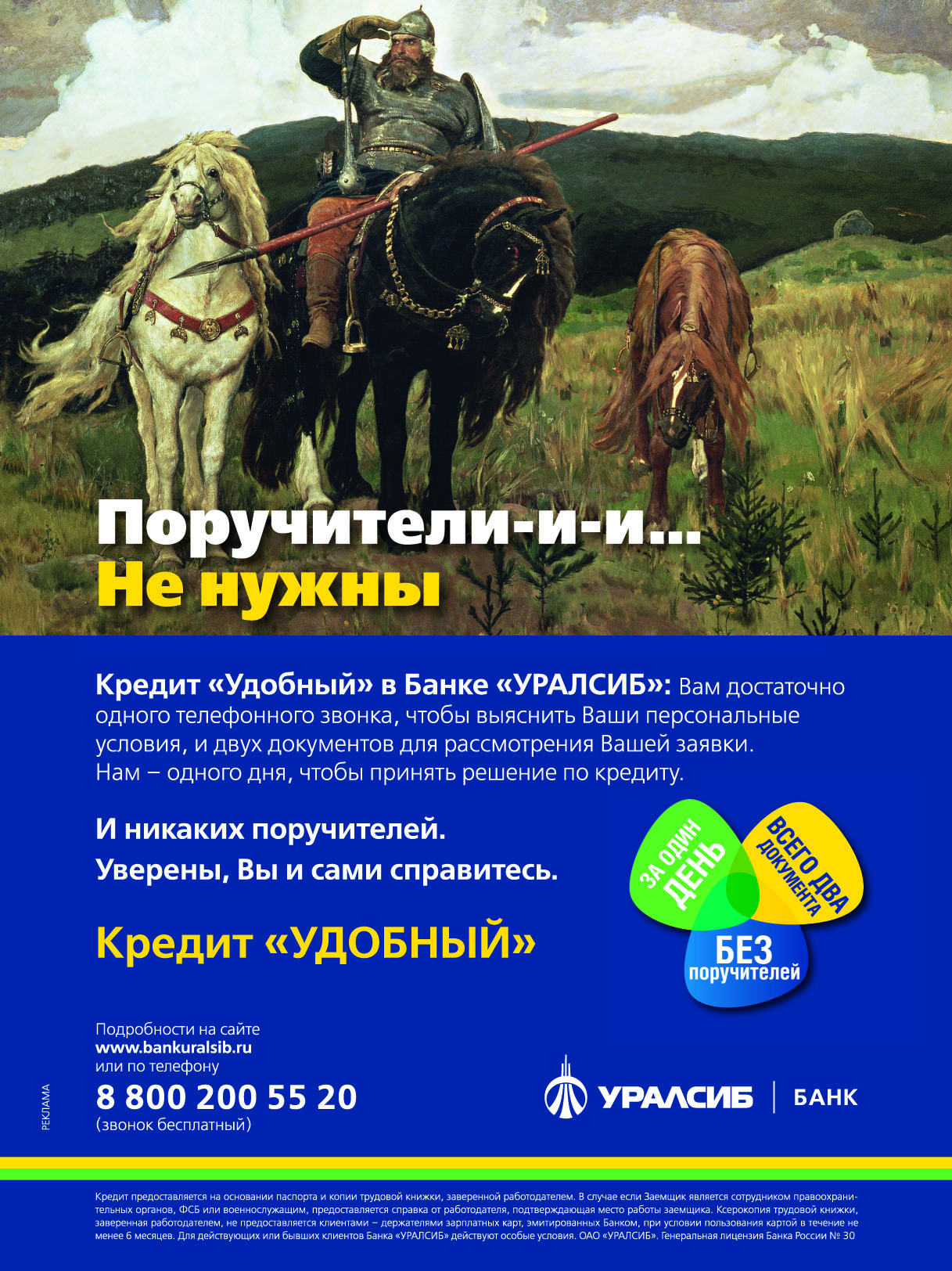 В основе креативной концепции - отредактированная репродукция известной картины Виктора Васнецова "Богатыри". На ней - один лишь Илья Муромец, который сообщает, что поручители по кредиту в "УралСибе" не нужны.