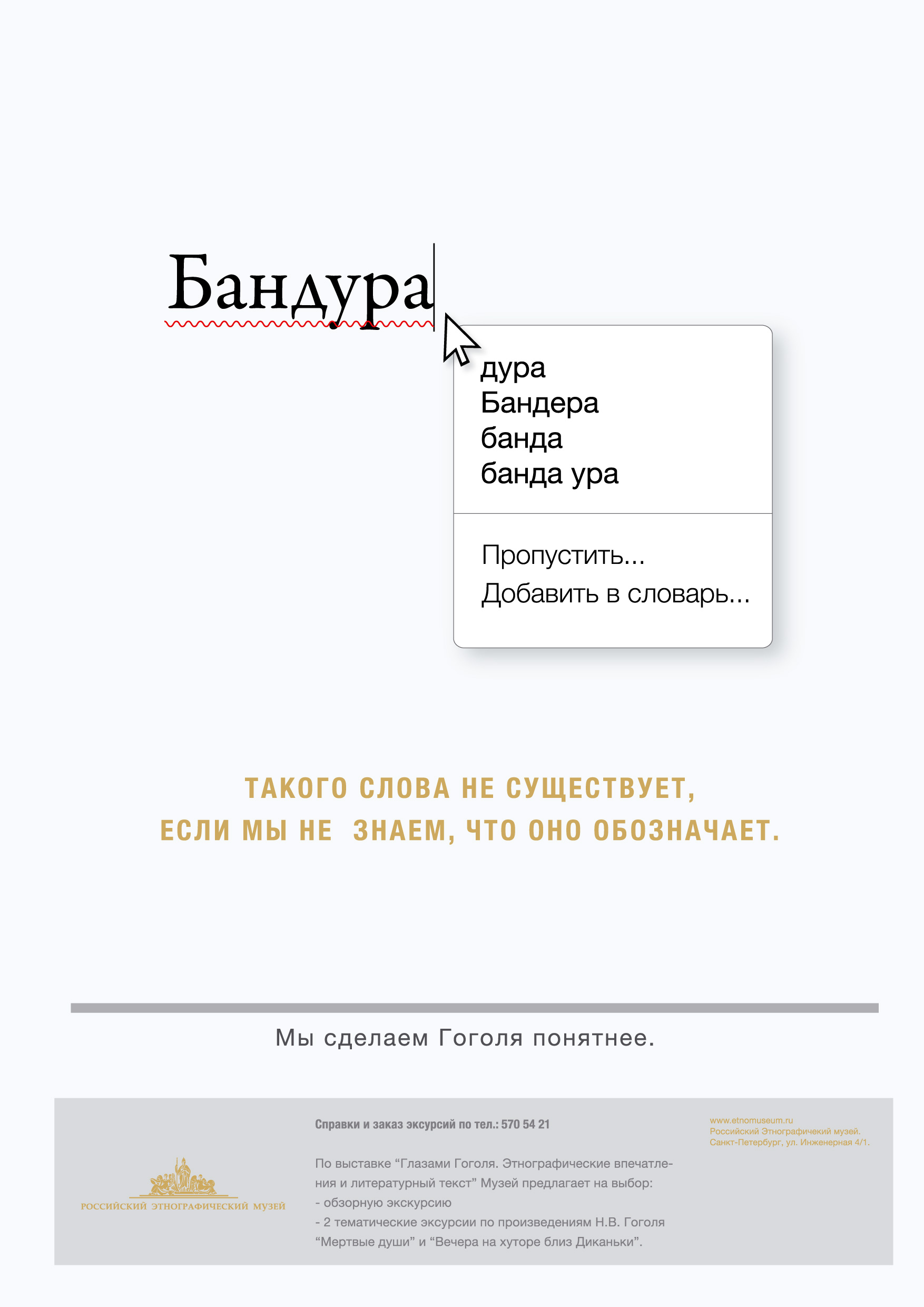 "Небо" пояснило школьникам разницу между Бандерой и бандуройКампания по привлечению в Российский этнографический музейВ 2009 году в Российском этнографическом музее открылась выставка, приуроченная к 200-летию со дня рождения Николая Гоголя. На выставке "Глазами Гоголя. Этнографические впечатления и литературный текст" были собраны многочисленные экспонаты, которые дают представление о российском и украинском быте первой половины XIX века. На выставке, к примеру, школьники могли не только узнать, что такое бричка, рушники или черевички, но и в буквальном смысле потрогать это руками. Для поддержки выставки и привлечения новых посетителей на выставку в конце 2009- начале 2010 гг. рекламное агентство "Небо" разработало рекламные материалы. Несмотря на то, что выставка, в первую очередь, была интересна юным посетителям, перед агентством стояла задача обратиться к учителям литературы, которые могли бы использовать выставку для своих выездных уроков или заказать платную экскурсию по выставке. Основная идея, которая легла в основу всех материалов, свелась к тому, что современные школьники, читая Гоголя, зачастую просто не понимают значения некоторых слов. А данная выставка этнографического музея помогает читать Гоголя "в оригинале". Плакаты форматов А5 и А3 размещались в декабре 2009 года в школах Адмиралтейского, Василеостровского и Центрального районов, а также в Академии постдипломного образования для учителей. Очень скромная по своему масштабу кампания, тем не менее, была оценена сотрудниками музея как результативная. Количество заказанных экскурсий после старта кампании возросло на 68%. Состав творческой группы Российский Этнографический Музей: Заведующая отделом внешних связей и PR: Жанна Чистякова Специалист отдела внешних связей и PR: Павел Лисицын Агентство "Небо": Креативный директор: Владислав Макаров, Наталья Смелова Копирайтер: Виктор Смирнов Арт-директор: Владислав Макаров Дизайнер: Оксана Девочкина Аккаунт-менеджер: Анна Полуектова |