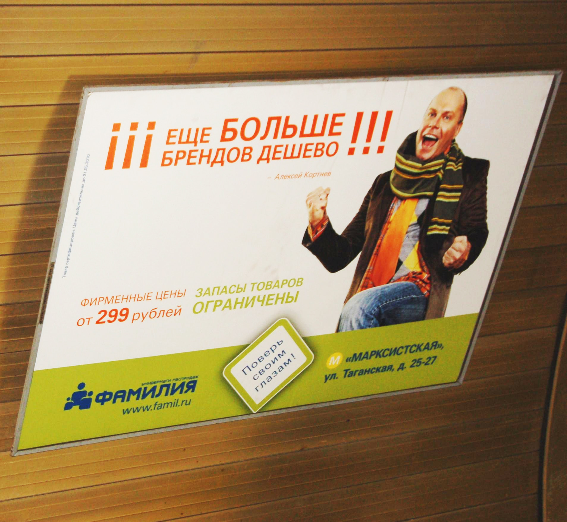 Алексей Кортнев вернулся в "Фамилию"Недавно завершилась рекламная кампания сети магазинов "Фамилия" "Моде все равно, где ты одеваешься". Ей на смену пришла новая - с Алексеем Кортневым. Музыкант и певец стал лицом рекламной кампании "Фамилии" в сентябре прошлого года.Как сообщили в агентстве Maxima, которая работает с "Фамилией", для продолжения кампании организовали новую фотосессию с Кортневым и немного изменили слоган. Размещение продлится до конца весны. Татьяна Полякова, Sostav.ru Фото автора |