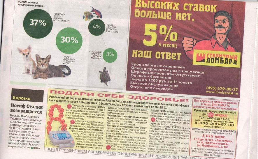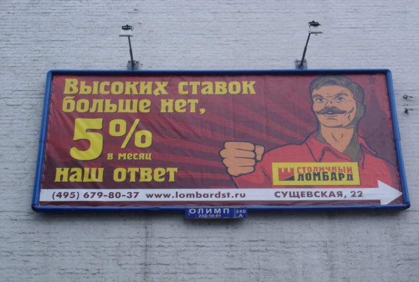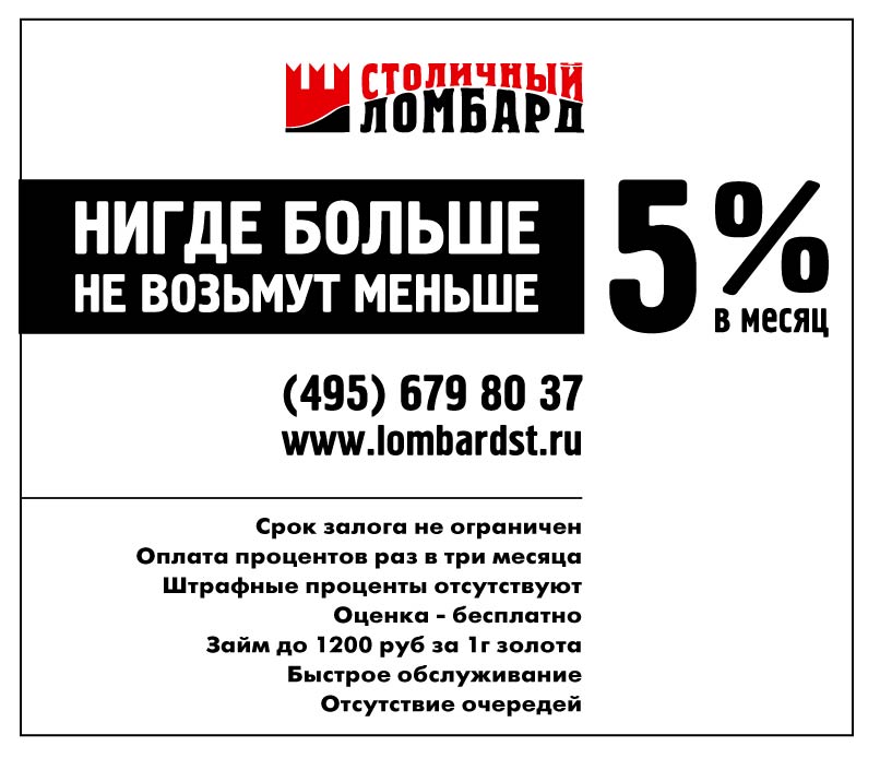 Ломбарды напомнят о себе рекламой"Столичный ломбард" начал продвижение своего нового предложения в сфере предоставления займов.Агентством "Модуль Про" разработана креативная составляющая концепции продвижение: визуализация предложения, имиджи и слоган. Рекламная кампания запущена с 01 марта 2010 года на территории Москвы. Уже проявившиеся первые положительные результаты позволили продлить кампанию до конца лета. Среди задействованных каналов - реклама на транспорте: метрополитен, автобусы, троллейбусы - 1 200 рекламных мест; наружная широкоформатная реклама - более 100 рекламных мест; BTL - 700 000 единиц печатной продукции. Кроме того, в соответствии с новой рекламной концепцией, агентство выполнило наружное оформление отделений сети ломбардов и подготовило к открытию 2 новых отделения. |