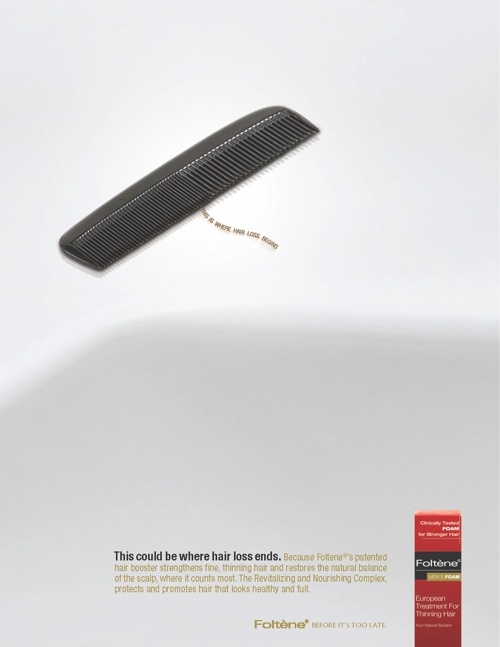 С Foltine выпадение волос закончится, едва начавшисьРеклама средства от облысенияАмериканское рекламное агентство Essertier Advertising разработало кампанию для средства против выпадения волос Foltine. Коммуникация строится на изображении того, где обычно можно заметить первые признаки начала облысения, как-то волосы в ванной, на подушке или на расческе. Причем изображение выпавшего волоска в действительности надпись "Здесь началось выпадение волос", а у изображения упаковки Foltine эта фраза продолжается: "Здесь выпадение волос может закончиться". Идея крайне проста и отлично реализована, без избытка креатива как это было в недавней рекламе Hair Club. Состав творческой группы Advertising Agency: Essertier Advertising, Norwalk CT, USA Creative Director: David Essertier Art Director: Andrew Harrison Copywriter: Darren Jeffries |
