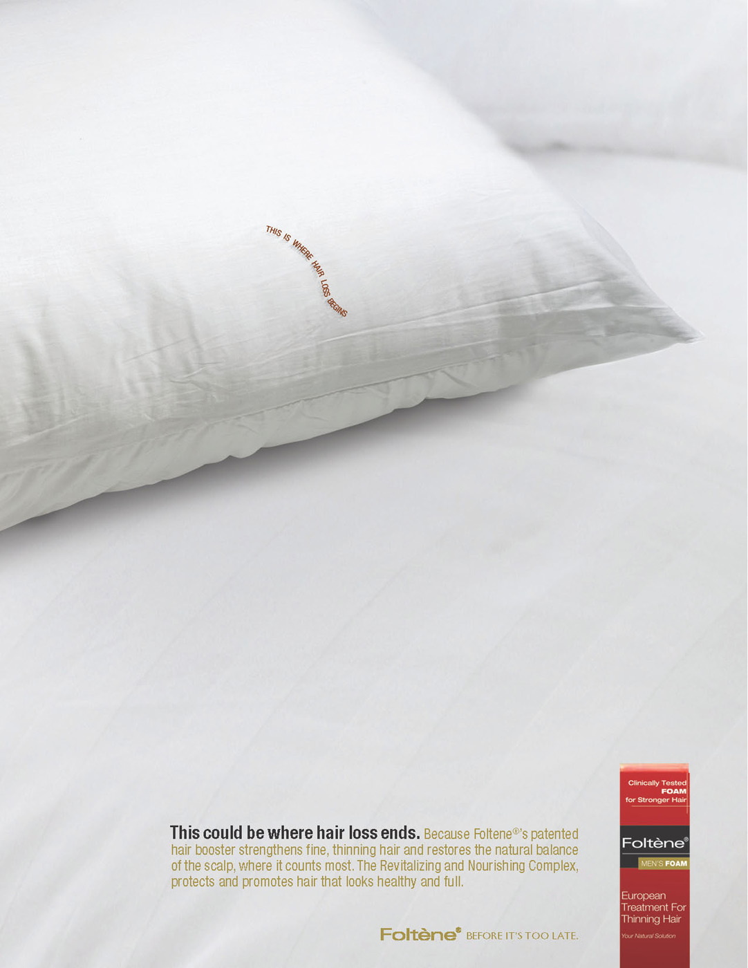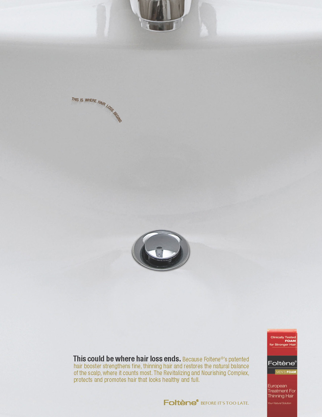 С Foltine выпадение волос закончится, едва начавшисьРеклама средства от облысенияАмериканское рекламное агентство Essertier Advertising разработало кампанию для средства против выпадения волос Foltine. Коммуникация строится на изображении того, где обычно можно заметить первые признаки начала облысения, как-то волосы в ванной, на подушке или на расческе. Причем изображение выпавшего волоска в действительности надпись "Здесь началось выпадение волос", а у изображения упаковки Foltine эта фраза продолжается: "Здесь выпадение волос может закончиться". Идея крайне проста и отлично реализована, без избытка креатива как это было в недавней рекламе Hair Club. Состав творческой группы Advertising Agency: Essertier Advertising, Norwalk CT, USA Creative Director: David Essertier Art Director: Andrew Harrison Copywriter: Darren Jeffries |