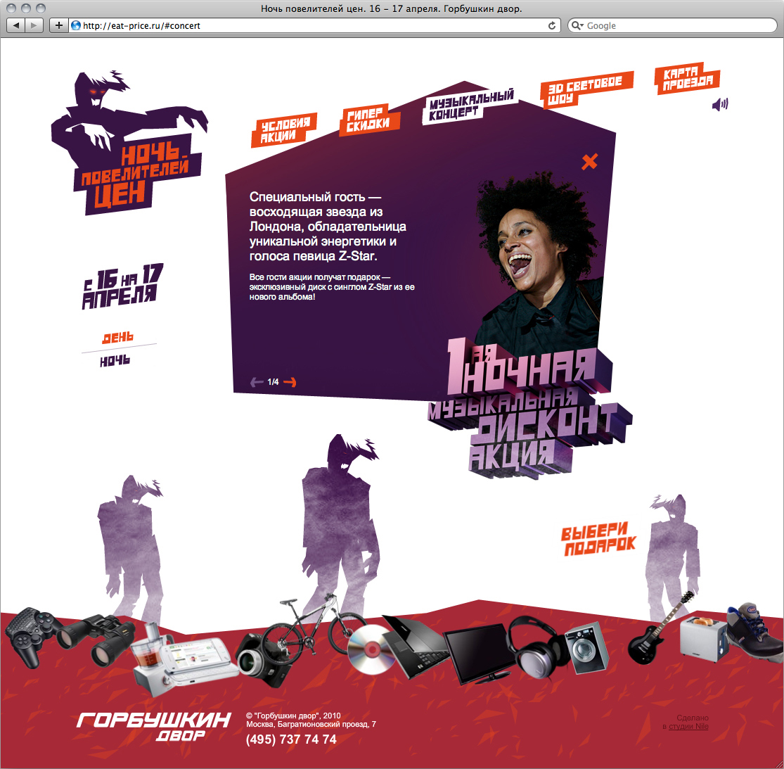 "Горбушкин двор" готовится к Ночи повелителей ценВ ночь с 16 на 17 апреля в технопарке "Горбушкин двор" пройдет "Ночь повелителей цен". Это первая и единственная в своем роде ночная музыкальная дисконт-акция. Ночью здесь пройдут музыкальный концерт, уникальное световое 3D-шоу.В студии Nile для этой акции был разработан фирменный зомби-стиль, в котором выдержан и сайт. В рамках рекламной кампании в городе появилась наружная реклама: сити-форматы, билборды, ролики для размещения на городских светодиодных экранах, макеты для размещения в метро. Состав творческой группы: Арт-директор: Владимир Черносвитов Дизайнеры: Дмитрий Зуев, Ростислав Магай Программинг: Игорь Скачков Производство видео: Art.Production Студия Nile выражает благодарность Марку Бергеру за креативное участие в проекте. |