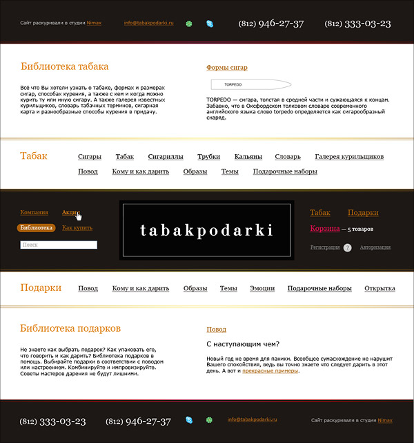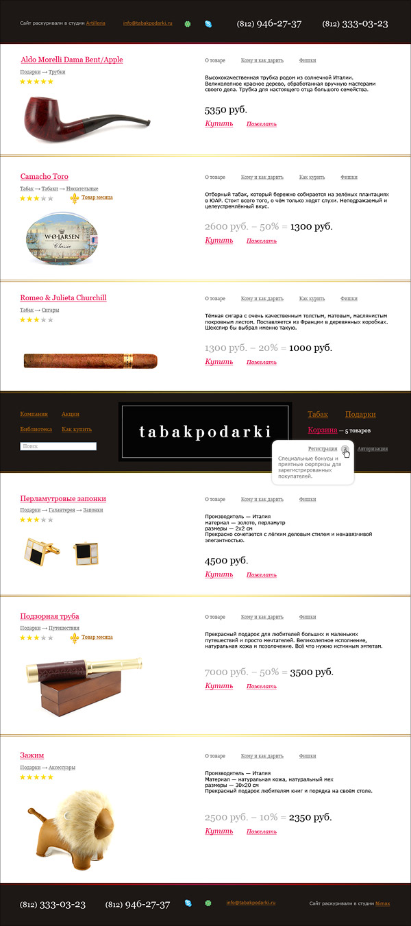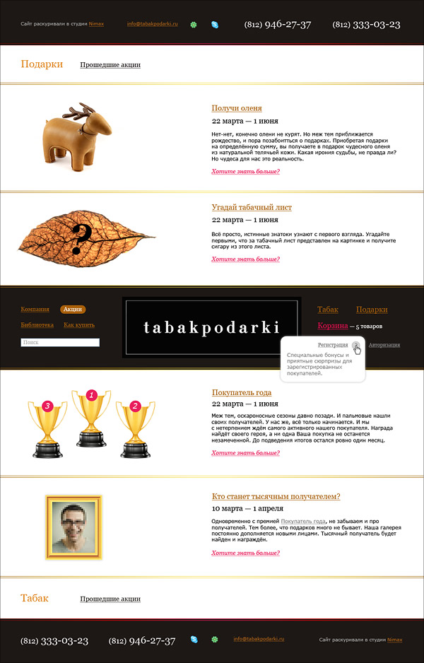 Дизайн-студия "Nimax" упаковала "Табакподарки"Петербургская сеть "Табакподарки" - это 28 магазинов, расположенных в местах с высокой проходимостью, в основном в гипермаркетах. Задача, поставленная перед студией, состояла не только в создании интернет-магазина, но и в привлечении новых категорий покупателей, не охваченных оффлайновыми точками продаж.Проведя анализ потенциальных целевых аудиторий, специалисты студии определили такую группу потребителей. Это офисные работники, не занимающиеся регулярными покупками продуктов и потому мало знакомые с предложением клиента. Для них основным критериями выбора хорошего магазина являются удобство покупки и доставки, широкий ассортимент, помощь в выборе и различные приятные бонусы. "Еще на этапе сбора информации для составления ТЗ мы попросили сотрудников компании "Табакподарки" провести анкетирование среди своих продавцов - тех, кто непосредственно общается с покупателями", - рассказывает менеджер проекта Надежда Кудреватых. "Цель опроса - выявить, что интересует людей при выборе товаров, какие вопросы или сложности возникают. Интересно, что с вопросами к продавцам обращаются 90% покупателей. Им нужны как общие сведения - какой табак крепче, как выбрать кальян, какие бывают формы трубок, - так и просто советы. Например, "что подарить мужчине 50 лет, без в/п, с ч/ю, не знаю, чем он увлекается". Решением задачи по созданию интернет-магазина и стал сайт tabakpodarki.ru. Каталог дополнен широкими возможностями подбора товаров по различным параметрам (поводы, получатель подарка, тип товара и другие), а также библиотекой знаний о табаке и подарках. Сайт также является площадкой для проведения акций и обратной связи с клиентами (например, наряду с галереей известных курильщиков существует и галерея любимых покупателей). Состав творческой группы "Nimax" Менеджер: Надежда Кудреватых Арт-директор и дизайнер: Ульяна Кожевникова Веб-технолог: Артур Кротов Прогаммист, верстальщик: Сергей Сорокин Копирайтер: Иннокентий Нестеренко |