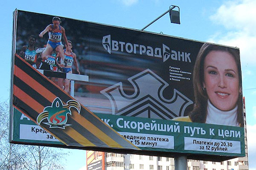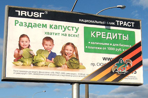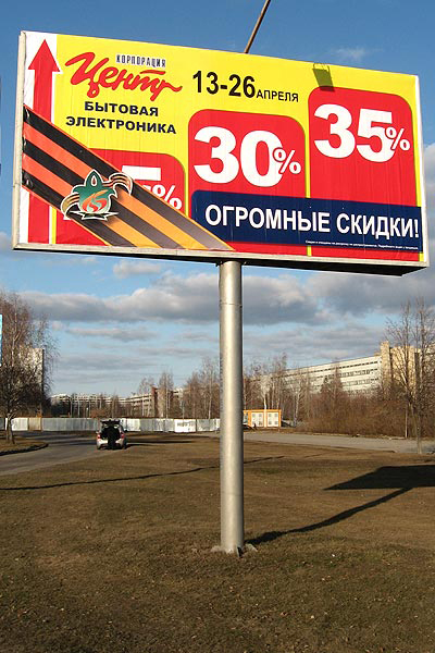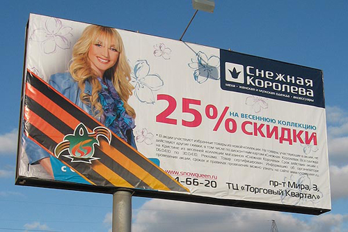 Георгиевские ленточки украсили мясной фаршМэрия города Набережные Челны таким образом готовится к 9 МаяСвоеобразно решили поздравить ветеранов Великой Отечественной войны в Набережных Челнах. Здесь, по сообщению газеты "БИЗНЕС Online" городская администрация обязала украсить георгиевскими ленточками все рекламные щиты 6х3. В итоге ленточки скрыли от взглядов горожан самую важную информацию для компаний: телефоны, адреса рекламодателей, нередко и логотипы компаний. Как стало известно газете "БИЗНЕС Online", в ожидании 9 Мая исполком города разослал в рекламные компании официальные предписание, обязывающее их разместить атрибутику Победы на билбордах. Изготовить эти ленты компании должны были, естественно, за свой счет. Разместить их на щитах было велено в трехдневный срок, начиная с 6 апреля. Акция продлится до 10 мая. "Бизнес online" приводит Альбины Бакировой, руководителя отдела продаж РА "Золотой город": "Отдавать дань ветеранам, безусловно, очень важно. Но апрель стал первым месяцем, начиная с кризисного 2009 года, когда клиенты начали "оживать", на щиты появилась "загрузка": А мы вместо прибыли получили убытки - потеряли около миллиона рублей. Сейчас приходится изготавливать наклейки с телефонами и монтировать на видное место на щите. Либо клиенты сами переделывают макеты с учетом размеров ленточки". Добиться от властей города комментариев по поводу сложившейся ситуации журналистам местных СМИ пока не удалось.