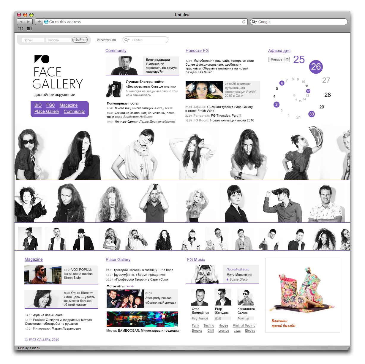 Портал Face Gallery поменял лицоFace Gallery - симбиоз сайта и закрытого клуба, созданный для тех, кто хочет общаться с интересными людьми, узнавать о новых героях современности, следить за тенденциями и событиями в мире моды, культуры, ночной жизни, туризма, музыкальной и киноиндустрии.Проект вышел на новый уровень и комплексная система айдентики, редизайн сайта стали неизбежны. Новый стиль Face Gallery подчеркивает основную ценность проекта - люди. Проведенный редизайн отвечает современным тенденциям и в то же время не является слепым следованием. Логотип Face Gallery приобрел форму шифра "FG", в сочетании с фотоизображением логотип становится уникальным, персонализированным символом, акцентирует внимание на отношении человека к сообществу. Этот графический прием позволяет конструировать разные логотипы в зависимости от ситуации их применения, не выходя за четкие рамки символа "FG". Дизайн сайта выполнен в минималистичном стиле, акцент сделан на максимально удобном восприятии информации. На сайте сохранены принципы айдентики, игра символов "FG", типографики, пиктограмм, черно-белые снимки. Автор концепции и дизайна проекта - Роман Ерохнович. |