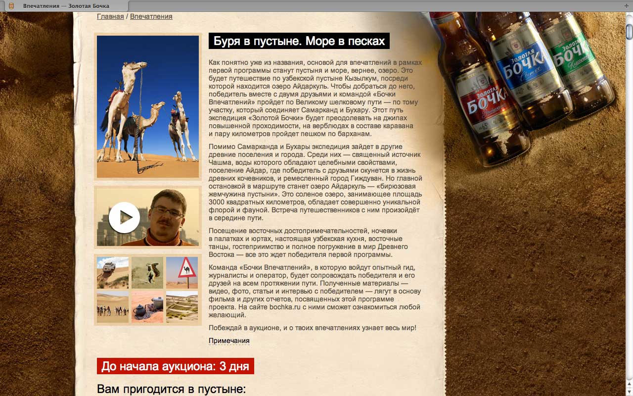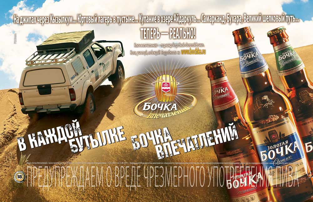 В рамках кампании «Бочка Впечатлений» на протяжении первого года будет организован целый ряд уникальных приключений для настоящих мужчин: трофи по Великому шелковому пути, по отрезку, расположенному в одной из самых больших пустынь в мире - Кызылкум, поездка на действующий вулкан на Камчатке, рыбацкие соревнования в дельте Волги и другие не менее интересные приключения. Организацию приключений взяло на себя агентство New Point.