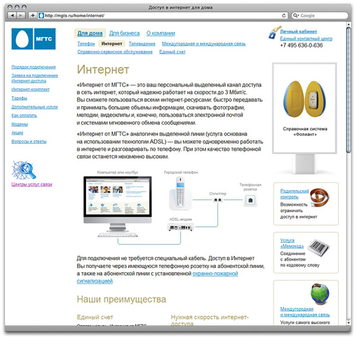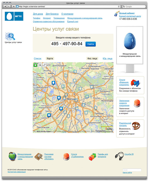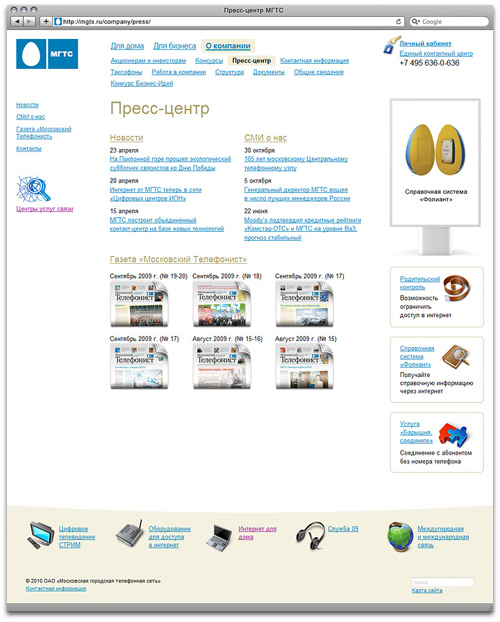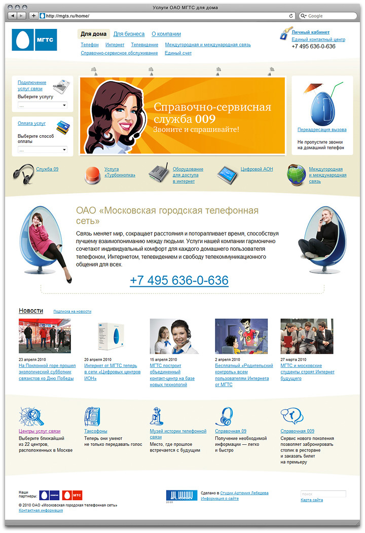 Сайт для МГТС сделали удобнее и ярче в Студии ЛебедеваДля компании "Московская городская телефонная сеть", предоставляющую проводную связь, в Студии Артемия Лебедева разработали сайт.Как пишут на сайте Студии, на нем люди могут узнать об услугах, которые МГТС оказывает частным лицам и организациям, изучить информацию о компании и пользоваться различными сервисами. Один из сервисов по номеру телефона определяет узел связи, который этот номер обслуживает. Специальные разделы посвящены цифровому телевидению и организации интернет-доступа. Наглядные схемы помогают абоненту самостоятельно подключить оборудование и оценить, что он получит в итоге. Кроме того, на сайте есть рассказ с картинками о музее истории и развития МГТС. Другие интересные вещи собраны в подшивке газеты "Московский телефонист" за семь лет. На сайте МГТС его владельцы пишут, что портал сохранил корпоративный стиль, став еще дружественнее, удобнее, ярче и информативнее. Особое внимание уделялось разработке удобной навигации, чтобы на необходимую страницу можно было перейти не более чем за 2-3 перехода по страницам. Состав творческой группы: арт-директор - Артемий Лебедев дизайнеры - Владимир Шрейдер, Олег Морев техдизайнер - Андрей Ткаченко пиктографист - Сергей Рачок технологи - Дмитрий Котельников, Алексей Хапов, Артем Ткаченко редактор - Александр Носиков менеджеры - Артем Гордин, Екатерина Корзина, Нина Лубышева |