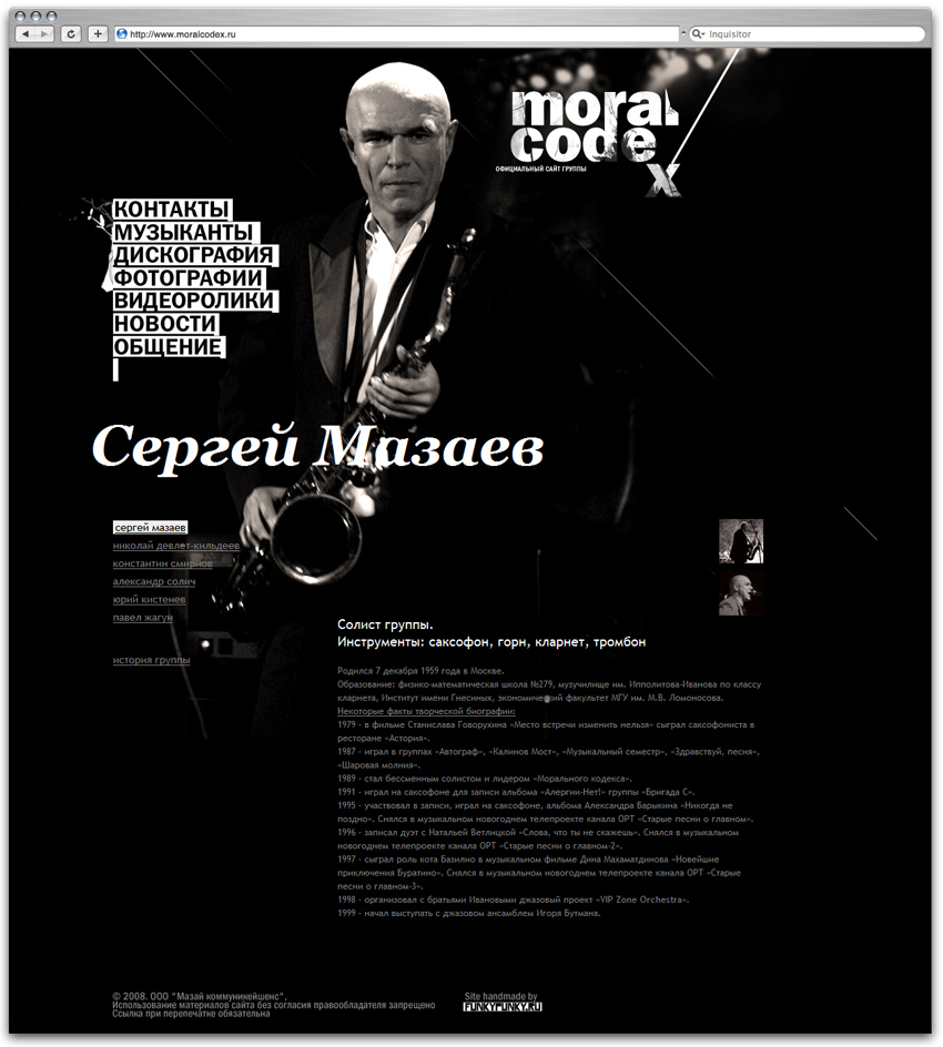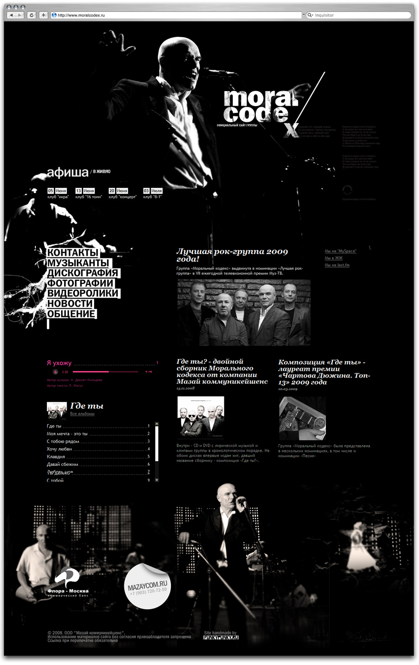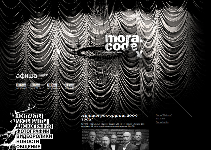 Группа "Моральный Кодекс" заказала сайт студии Funkypunky.ru"При создании сайта мы старались максимально точно и объемно выразить характер и образ музыкального коллектива, - расскзывают дизайнеры. - В связи с этим, были выявлены и проанализированы главные эмоциональные составляющие группы и ее лидера - Сергея Мазаева. И в результате, в качестве основного визуального элемента, стали черно-белые фотографии группы, выполненные в "театральном стиле". Они-то и передали всю глубину поэтической составляющей Сергея Мазаева и его музыки.Кратко дизайн сайта можно охарактеризовать такими словами, как: сильный, творческий, эмоциональный, достойный. Монохромная черно-белая гамма позволила придать дополнительную экспрессивность образам. Как правило, уникальной делают только входную страницу сайта, а все внутренние разделы верстают по единому шаблону. Здесь же вы увидите совсем другой подход: каждый раздел разрабатывался отдельно, обладает своей модульной сеткой и уникальным визуальным рядом. Главная страница также содержит в себе интересное решение - удачное сочетание имиджевой и информационной составляющих. Осуществить это удалось с помощью условного разделения пространства страницы на две разные части: в одной присутствует сильный визуальный образ, другая наполнена текстовой содержанием. Хорошо продуман темпоритмический ряд разделов: на начальных страницах, как правило, преобладают графика и фотографии, снабженные краткими лаконичными текстовыми описаниями, а подробные объемные текстовые материалы можно найти на страницах уже более глубокого уровня. Также в рамках работы над проектом был создан логотип, который вначале планировалось использовать только на сайте. Но через некоторое время оно настолько понравилось музыкантам, что ребята стали использовать его в качестве основного - при оформлении своих афиш, дисков и промопродукции. Работа над проектом включила в себя как разработку идеи и дизайна сайта, так и реализацию его технической составляющей. |