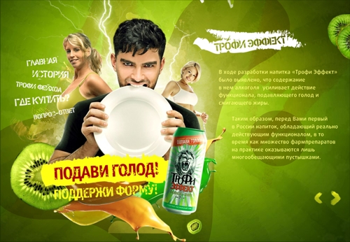 "Хэппилэнд" придумал УТП алкоголя: эффект похуденияКомпания Happyland - владелец и производитель таких известных слабоалкогольных марок, как "Казанова" и "Ягуар", начал кампанию еще одного своего популярного бренда - "Трофи".На рынок выведен новый продукт линейки - слабоалкогольный коктейль "Трофи Эффект". В поддержку новинки в столичном метрополитене появились рекламные щиты со слоганом "Подави голод", а студией Deluxe Interactive разработан портал trophydrink.com. В оформлении сайта используются те же иллюстрации, что и в наружке. В студии Deluxe Interactive Sostav.ru рассказали, что макеты для оформления портала предоставил заказчик. Компания Happyland пока никак не прокомментировала начало рекламной кампании. Интересно позиционирование нового "Трофи". По словам производителей, он подавляет чувство голода и тем самым способствует снижению веса. Как написано на сайте напитка, человечество давно думает над проблемой снижения веса. И не все решения сводятся к тому, что надо меньше есть и больше двигаться. Есть и другие способы. Видимо, употребление слабоалкогольных коктейлей - один из них. "Трофи Эффект" содержит растительный экстракт, который традиционно добавляют в похудательные средства. "Он избавляет от чувства голода и способствует сжиганию жира". "Ты можешь одновременно наслаждаться отличным вкусом фейхоа+киви и веселой, беззаботной жизнью в компании друзей. Природа работает на тебя: часики тикают, а есть не хочется, и лишние калории "сгорают" в организме", - так рассказывает о действии коктейля производитель. Что касается семиградусной алкогольной сути нового продукта, "Хэппилэнд" подчеркивает следующий интересный с маркетинговой точки зрения факт: "В ходе разработки напитка "Трофи эффект" было выявлено, что содержание в нем алкоголя усиливает действие функционала, подавляющего голод и сжигающего жиры. Таким образом, перед Вами первый в России напиток, обладающий реально действующим функционалом, в то время как множество фармпрепаратов на практике оказываются лишь многообещающими пустышками". Кстати, в 2008 году "Хэппиленд" провел рекламную кампанию в поддержку популярного бренда слабоалкогольных коктейлей, известных под общим названием «Кольца» и позиционирующихся в среднем ценовом сегменте. Тогда производитель также отказался комментировать рекламную кампанию. Татьяна Полякова, Sostav.ruФото Sostav.ru |