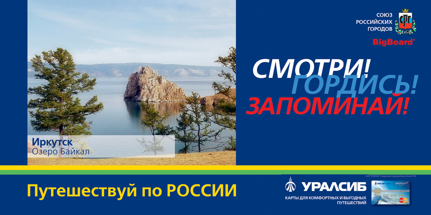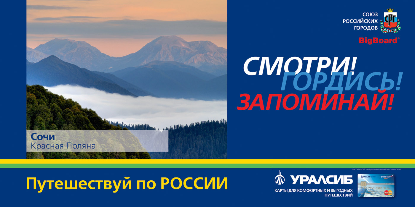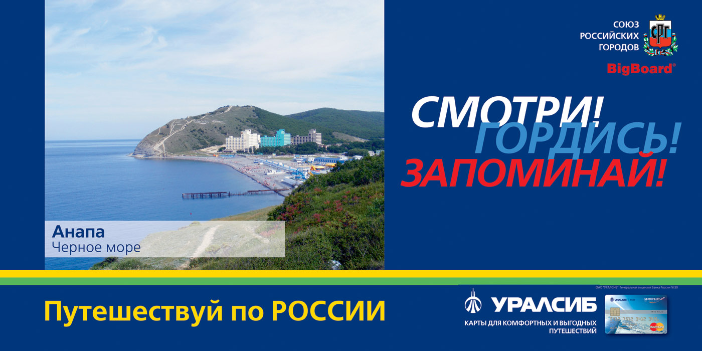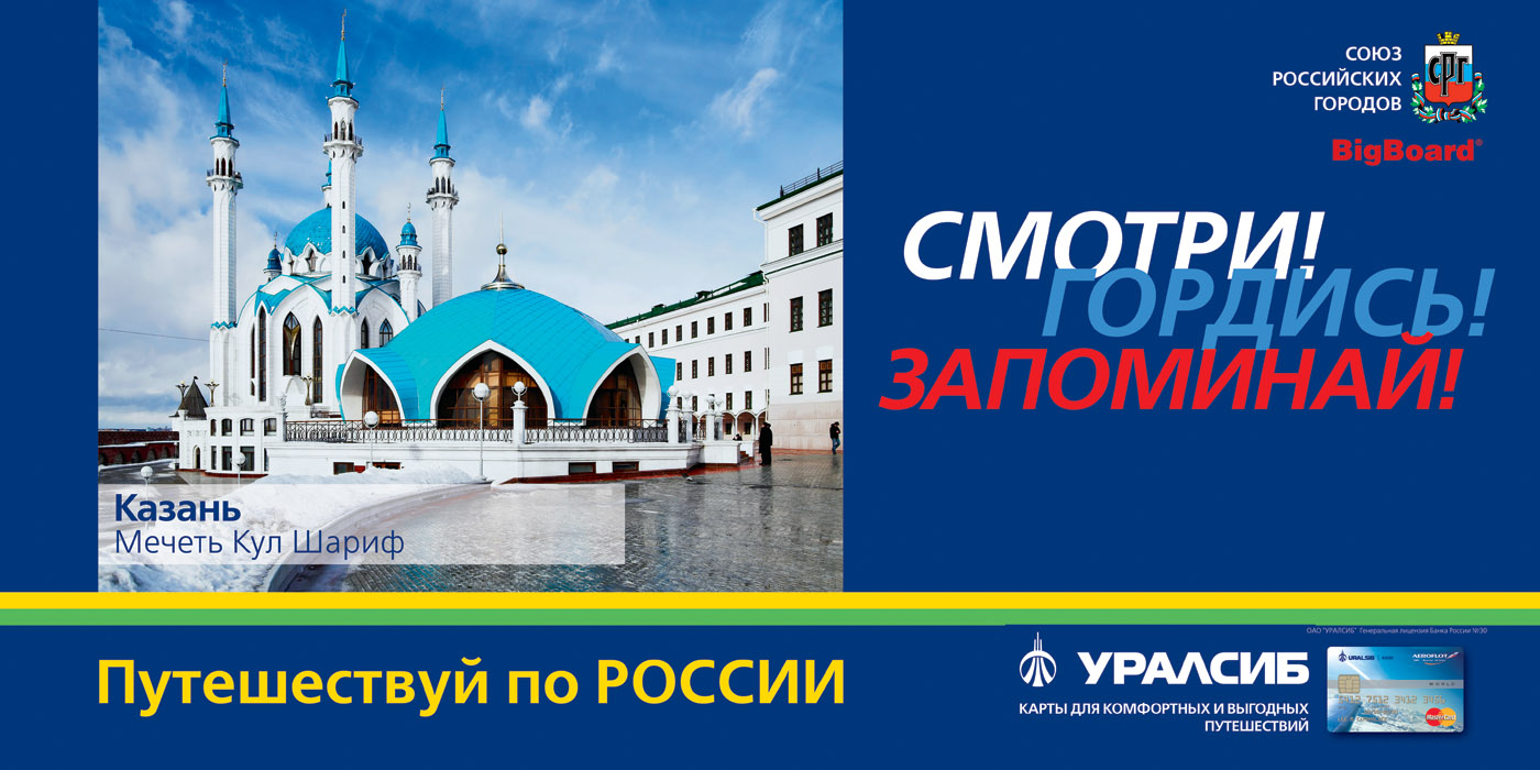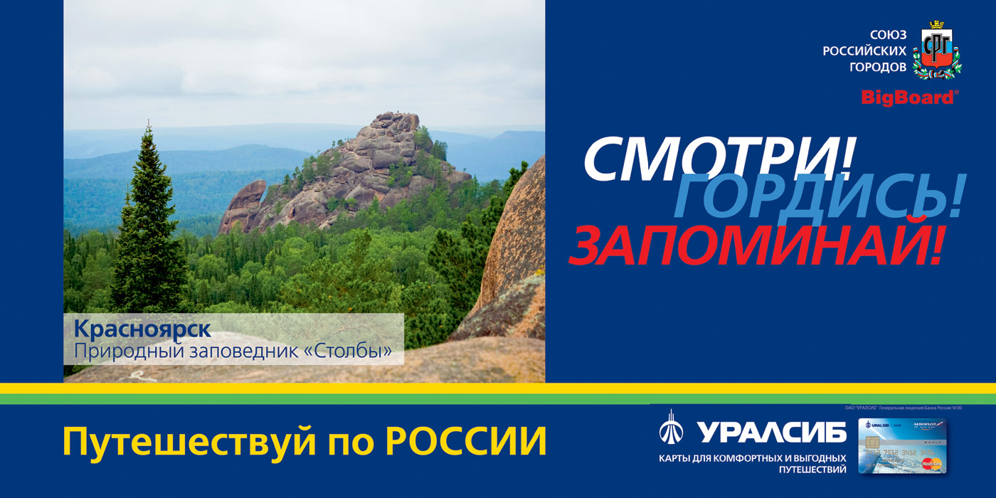 Социальная реклама призывает "Смотри, гордись, запоминай!"Фонд "Народная инициатива" при поддержке "Союза российских городов" и при содействии компании BigBoard и банка "УРАЛСИБ" инициировали всероссийский информационный проект - "Путешествуй по России!" со слоганом "Смотри, гордись, запоминай!".Проект стартовал в середине марта и продлится до 15 июня. Основная цель кампании - привлечь внимание россиян к культурному достоянию городов России, тем самым увеличив спрос на внутренний туризм. В рамках проекта более чем в 20 городах России будут размещены рекламные носители - конструкции наружной рекламы, содержащие фотографии ярких и значимых культурных и географических достопримечательностей разных российских городов. |