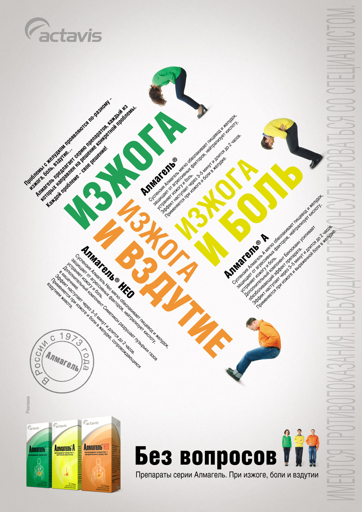 Новая креативная концепция "Алмагеля" снимет все вопросыФармацевтическая компания "Актавис", совместно с РА PRIOR, разработала коммуникационную стратегию для продвижения препаратов серии "Алмагель". Кампания пройдет в два этапа и охватит все ключевые каналы коммуникаций: телевидение, радио, прессу.Зонтичный бренд "Алмагель" присутствует на российском рынке уже более 30 лет и хорошо знаком потребителям как эффективное средство от "проблем с желудком". На сегодняшний день бренд объединяет уже три препарата , каждый из которых эффективен в решении конкретной проблемы: "Алмагель" - при изжоге, "Алмагель А" - при боли в желудке, "Алмагель НЕО" - при изжоге со вздутием живота. Одна из важнейших задач, стоящих сегодня перед компанией "Актавис", заключается в обновлении образа бренда "Алмагель" и привлечение к нему более молодой аудитории. А также - в донесении до потребителей отличий и преимуществ каждого из трех препаратов. Эти задачи нашли отражение в новой креативной концепции под названием "Без вопросов". В центре внимания - фигуры людей, которых боль в желудке заставила согнуться пополам. Именно такую позу, согласно результатам проведенных исследований, стремится принять большинство людей при дискомфорте и боли в желудке. Визуально каждая из этих фигур напоминает вопросительный знак. "Снять вопрос" и вернуть человеку привычное, комфортное состояние поможет "Алмагель", предлагающий специализированное решение для каждой из трех обозначенных проблем: изжога, боль в желудке, вздутие живота. Стоит отметить, что подобный стиль сообщения не совсем характерен для российской фарм-рекламы. Возможно, впервые, за последнее время, при рекламе подобного лекарственного средства, удалось обойтись без эксперта в белом халате и познавательного 3D -путешествия по человеческим внутренностям. Идея креативной концепции реализована в ТВ-ролике (хронометраж 25, 15 и 5 сек.), и макете в прессу. Рекламная кампания стартовала 19 апреля 2010 г. и пройдет в два этапа. Первый этап: апрель - май 2010. Состав творческой группы Компания "Актавис" Руководитель бизнес подразделения безрецептурной группы препаратов: Яковлев Артур Групп продакт-менеджер подразделения безрецептурной группы препаратов: Романенко Наталия Рекламное агентство "Приор" Директор по работе с клиентами - Елена Климова Руководитель группы по работе с клиентами - Михаил Голубев Руководитель креативной группы - Кристина Денина Директор по стратегическому планированию - Петр Троицкий Копирайтер - Екатерина Антипова Арт-директор - Алексей Павлов Продюсер агентства - Коротаева Марина Продакшн студия - NINJAFILMS studio Режиссер - Залесский Леонид Продюсер - Ольга Савельева Постпродакшн продюсер - Людмила Цивилева Супервайзер графики - Тимур Залилов Композитор - Никита Рыбин Размещение в СМИ - компания "Медиа Эксперт" |