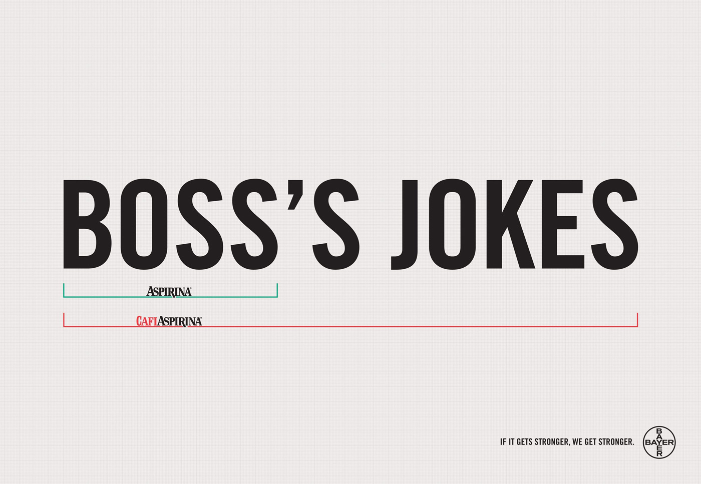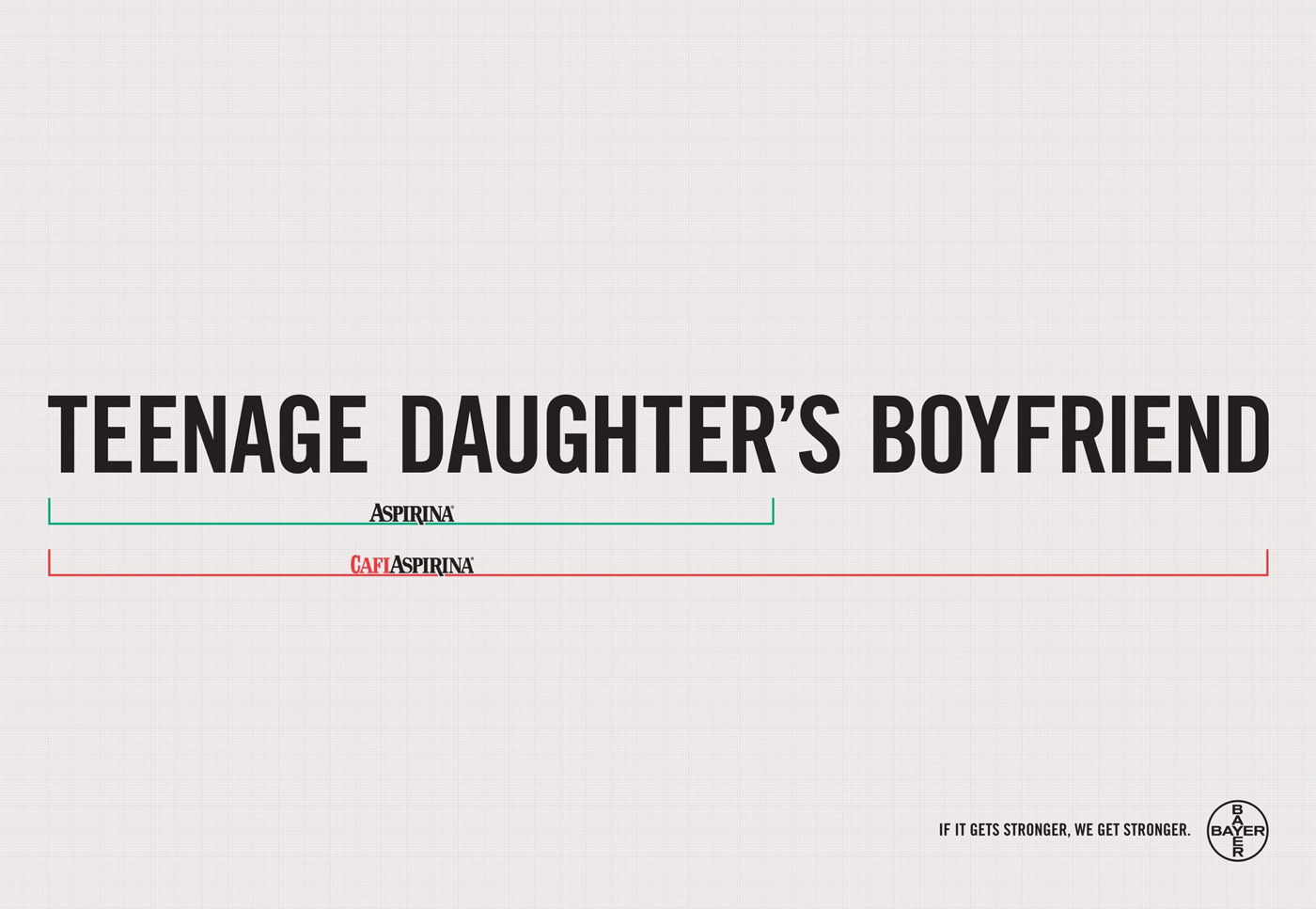 Bayer поможет выдержать шутки боссаРеклама средств от головной боли использует забавные сравненияБразильское Almap BBDO разработало серию принтов для рекламы болеутоляющего средства кафиаспирина от компании Bayer. Кафиаспирин - это аспирин с добавлением кофеина, благодаря чему эффект этого болеутоляющего вдвое сильнее чем от обычного аспирина. В рекламе этот факт отображен очень забавным образом. На принтах даны крупные надписи: "Приятель дочери подростка", "Шутки босса" и "Адвокат бывшей жены", которые подчеркнуты двумя отрезками, символизирующими действие болеутоляющих. И если сил аспирина хватит лишь на то, чтобы выносить бывшую жену, начальника или дочь-тинейджера, то кафиаспирин поможет выдержать и все с ними связанное. Слоган кампании "Если он становится сильнее, мы становимся сильнее" Состав творческой группы Advertising Agency: Almap BBDO, Brazil Executive Creative Director: Marcello Serpa Creative Directors: Luiz Sanches, Dulcidio Caldeira Copywriter: Marco Giannelli (pernil) Art director: Ary Nogueira Advertiser's supervisor: Maria Luiza Dias Typographer: Jos? Roberto Bezerra |