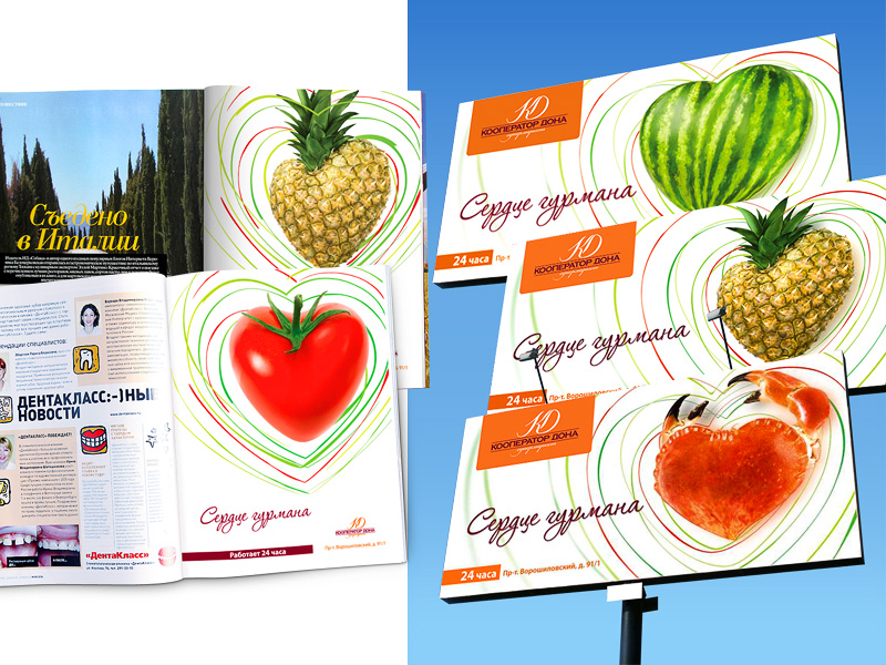 "Кооператор Дона" стал мишенью для гурманов"Кооператор Дона" - один из самых известных супермаркетов г.Ростова-на-Дону с устоявшейся целевой аудиторией. Главной задачей рекламной кампании было привлечение новых потребителей путем создания интересного, и в тоже время понятного образа.Кампанию разработали в агентстве Stors. Основной акцент сделан на премиальность как самого супермаркета, так и реализуемой им продукции. Выбран краткий и лаконичный слоган "Кооператор Дона - Сердце гурмана", наделяющий потребителя особым статусом "специалиста" в выборе продуктов питания. Основную идею отражают и новые яркие образы, привлекающие внимание своей необычностью (продукты в форме сердца). В рамках проекта были использованы такие каналы коммуникации, как традиционная наружная реклама (билборды 6х3), макеты в журналах и реклама на радио. Первый этап рекламной кампании стартовал в мае и продлится до конца июля 2010 г. |