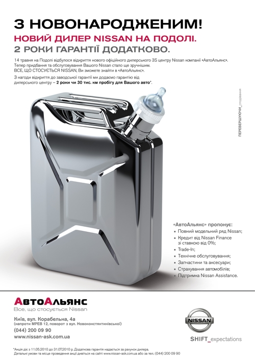 Креативное агентство родило NissanВ мае началось сотрудничество креативного агентства "Мичурин" и дилера автомобильной марки Nissan "АвтоАльянс". Чтобы анонсировать открытие нового салона, отличительной чертой которого является профессионализм в обслуживании, а также информировать целевую аудиторию о привлекательных условиях акции, была разработана нестандартная для этой категории идея. Рекламная коммуникация будет размещена в наружной рекламе, прессе, интернете."С дополнительной гарантией от "АвтоАльянс" автомобиль рождается заново. Отсюда и образ соски для кормления младенцев. Думаю, благодаря яркому вижуалу кампания не пройдет незамеченной. Ведь это именно тот случай, когда яркость не в ущерб смыслу сообщения", - рассказал Дмитрий Болсуновский, креативный директор РА "Мичурин". "Мы остановили выбор на новорожденной канистре, - говорит Алена Дрючина, начальник отдела маркетинга ДП "АвтоАльянс". - т.к. решили, что это действительно удачный и лаконичный способ решить сложную задачу: передать несколько сообщений в одном - и новость об открытии, и об акции, и конкретизировать вид деятельности компании". |