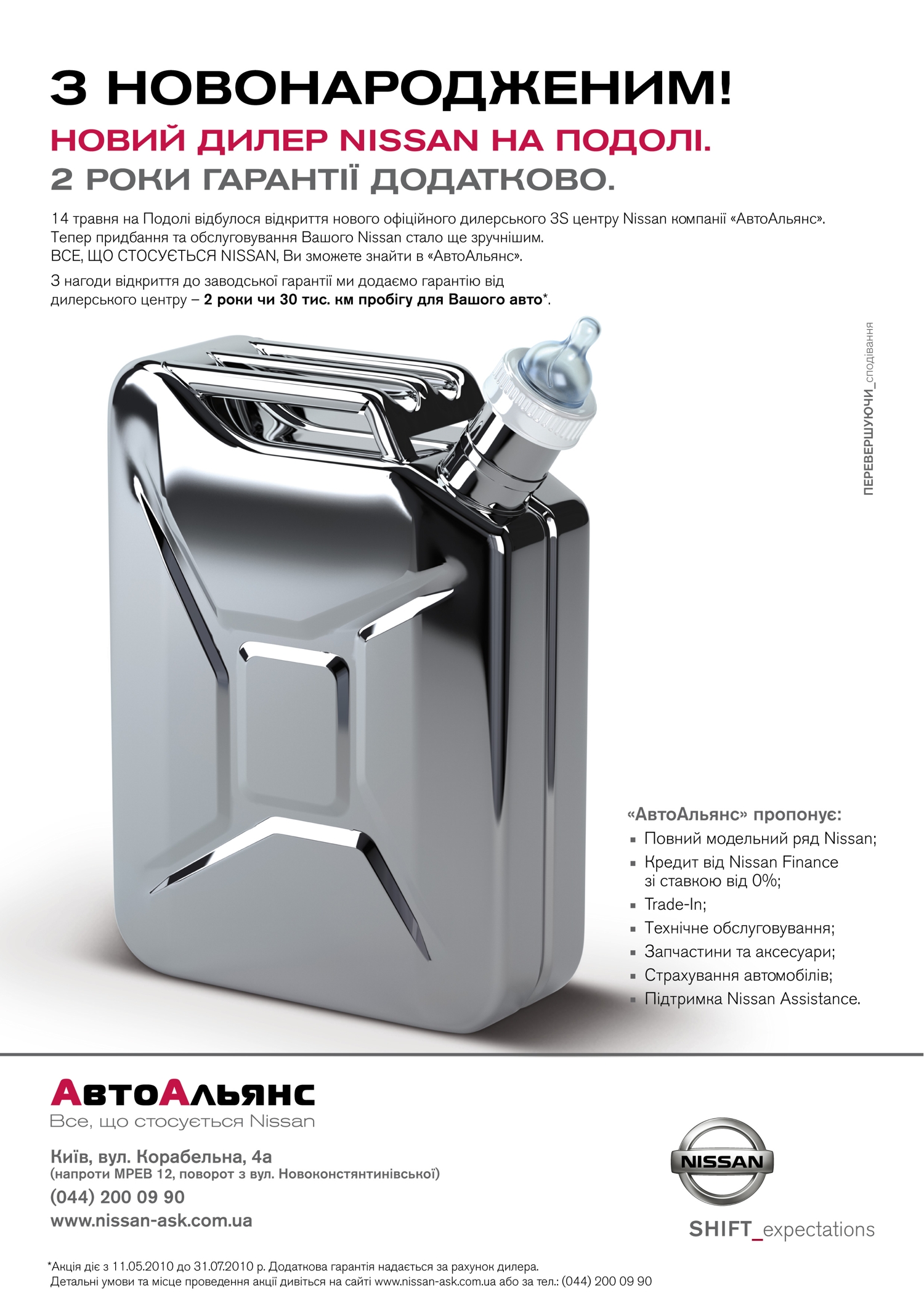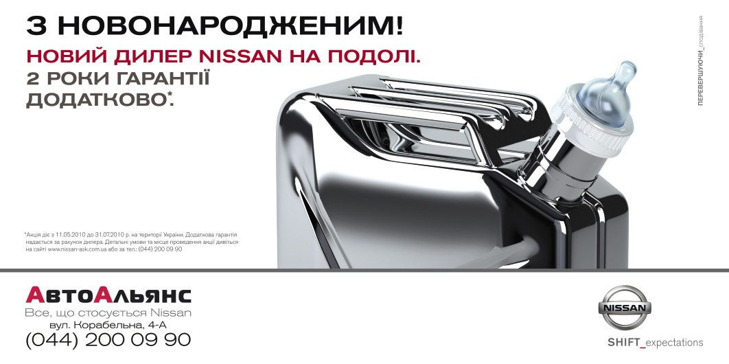 Креативное агентство родило NissanВ мае началось сотрудничество креативного агентства "Мичурин" и дилера автомобильной марки Nissan "АвтоАльянс". Чтобы анонсировать открытие нового салона, отличительной чертой которого является профессионализм в обслуживании, а также информировать целевую аудиторию о привлекательных условиях акции, была разработана нестандартная для этой категории идея. Рекламная коммуникация будет размещена в наружной рекламе, прессе, интернете."С дополнительной гарантией от "АвтоАльянс" автомобиль рождается заново. Отсюда и образ соски для кормления младенцев. Думаю, благодаря яркому вижуалу кампания не пройдет незамеченной. Ведь это именно тот случай, когда яркость не в ущерб смыслу сообщения", - рассказал Дмитрий Болсуновский, креативный директор РА "Мичурин". "Мы остановили выбор на новорожденной канистре, - говорит Алена Дрючина, начальник отдела маркетинга ДП "АвтоАльянс". - т.к. решили, что это действительно удачный и лаконичный способ решить сложную задачу: передать несколько сообщений в одном - и новость об открытии, и об акции, и конкретизировать вид деятельности компании". |