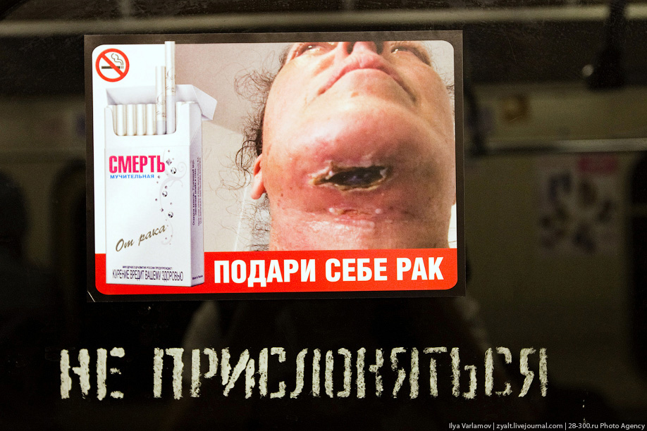 Активисты ЗОЖ: "Подари себе рак"Спустя месяц после своей акции на Третьем транспортном кольце, активисты ЗОЖ воплотили свой новый проект в московском метрополитене. Его они приурочили ко Всемирному дню без табака.В 7 утра 31 мая в вагонах кольцевой ветки были расклеены сотни баннеров с фотографиями последствий курения и надписью "Подари себе рак". Как сообщили Sostav.ru активисты ЗОЖ, пассажиры с интересом отнеслись к акции, некоторые (в том числе и сотрудник милиции) просили наклейки себе на память. Позиция активистов ЗОЖ такова: "Чиновники задуривают русский народ яркой рекламой, наживаясь на продаже сигарет! Они зарабатывают деньги на чужих смертях! Мы намерены остановить табачный беспредел. Мы будем и дальше проводить акции, раскрывающие правду о беззаконьи в стране. Народ должен знать, что творится вокруг!"