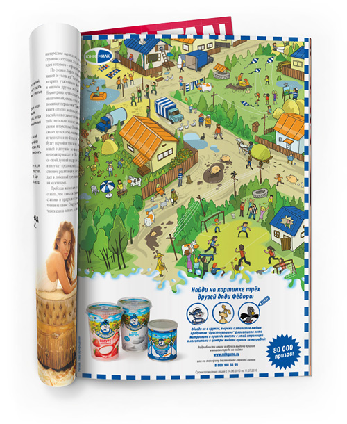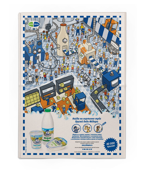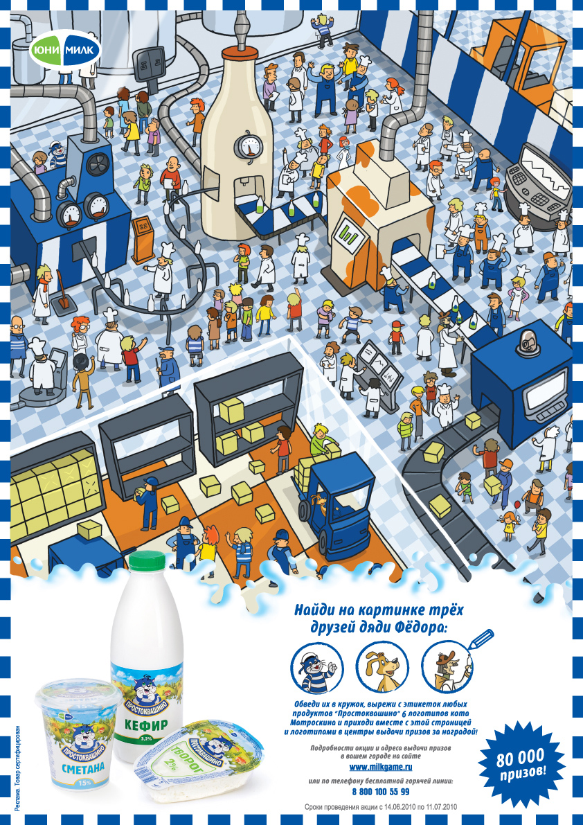 У "Простоквашино" появилась реклама в формате "Look And Find"Брендинговое и рекламное агентство БЛЭКВЕР запустило иллюстрированную летнюю рекламную кампанию в прессе в 15 городах России для торговой марки "Простоквашино" компании Юнимилк.Весной 2010 года по результатам исследований рынка США и Европы в креативном центре брендингового агентства родилась идея для "нишевой" рекламной кампании, вдохновением для которой стали картинки в стиле "Look And Find". Креативная концепция была предложена одному компании "Юнимилк". Концепция клиенту понравилась, совместными усилиями она была оперативно адаптирована и доработана под задачи заказчика и уже в мае 2010 года была запущена рекламная кампания для ТМ "Простоквашино" в 15 городах России. Для реализации проекта привлекли иллюстратора - Сергея Ратникова из Санкт-Петербурга, эскизный дизайн проектировался в Новосибирске, а основной объем работ и общее управление проектом выполнялись головным офисом и партнерами в Москве. Фундаментом кампании стали два высоко-детализированных рекламных модуля для печатных СМИ, на которых изображены праздник молока в деревне и экскурсия на молочном заводе. Задача зрителя - найти на картинках спрятанных персонажей из Простоквашино. Если правильно выполнить задание и приложить немного усилий к сбору логотипов с этикеток одноименной продукции, то можно получить гарантированные призы с их общим количеством 80000 штук. В поддержку рекламной кампании подготовлен также промо-сайт www.milkgame.ru, который обеспечивает участников акции всей необходимой информацией. Разработку визуальной идентификации бренда "Простоквашино", включая логотип и дизайн упаковки, осуществляло брендинговое агентство Depot WPF. Состав творческой группы Состав творческой группы Алексей Кондратьев - креативный директор Сергей Ратников - иллюстрации Дмитрий Сморогов - арт-директор, дизайнер Олег Цыбиков - дизайнер Роман Казьбан - предметная фотосъемка Коллектив ЦРИДУ - верстка и программирование |