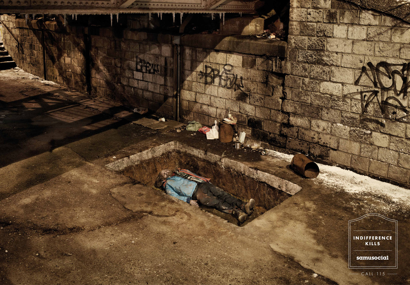 Безразличие зарывает нуждающихся в могилыРеклама общественной организации Samu SocialPublicis Conseil переняло эстафету создания рекламы, обыгрывающей тему безразличия людей к тем, кто нуждается в помощи. Рекламное агентство создало серию принтов для французской общественной организации, которая старается помочь бездомным людям, начиная с 1993. Принты изображают бездомных, которые в буквальном смысле опустились в могилу прямо там, где спали на улице. При этом слоган рекламы- "Безразличие убивает" - несет явно обвиняющий характер в адрес всех тех, кто предпочитает закрыть глаза на проблему бездомных. Ранее Samu Social изображало бездомных, утонувших в асфальте из-за безразличия окружающих, а также похожую тему использовала организация Amnesty International, но уже в рамках нарушений прав человека. Состав творческой группы Advertising Agency: Publicis Conseil, France Creative Directors: Veronique Sels, Olivier Altmann Art Director: Yves-eric Deboey Assistant art director : Jean Weessa Copywriter: Mathieu Degryse Photographer: Cedric Delsaux |