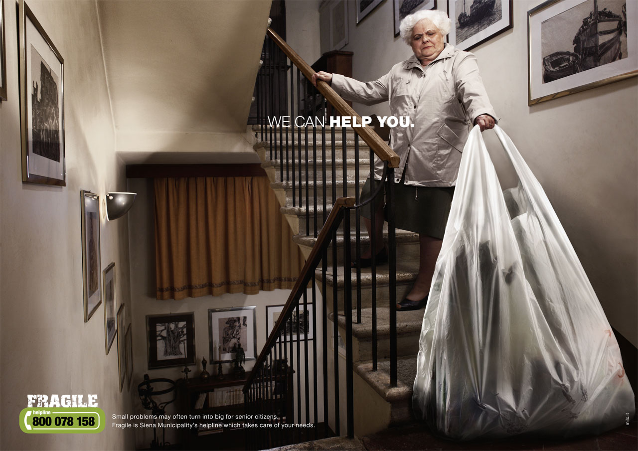 Fragile Municipality of Siena спешит на помощь старикамРеклама организации, осуществляющей уход за пожилыми людьмиАгентство Milc из Италии разработало серию принтов для компании Fragile Municipality of Siena, которая занимается обеспечением ухода за пожилыми итальянцами, у которых нет близких родственников, способных постоянно помогать им. Реклама представляет несколько гипертрофированных проблем, с которыми могут столкнуться старики - тяжелый пакет с продуктами, залетевшие в дом птицы или слишком твердая таблетка, которую не получается сломать пополам. Крупным лозунгом "Мы можем помочь вам" организация привлекает внимание как самих пожилых людей, сталкивающихся с подобными трудностями, так и их родственников, которые не могут сами обеспечить должный уход. Состав творческой группы Advertising Agency: Milc, Siena, Italy Creative Director: Giampiero Cito Art Director: Matteo Scheggi Copywriters: Giampiero Cito, Matteo Spadoni Illustrator: Benedetto Cristofani Photographer: Bruno Bruchi Strategic planner: Antonio Paolo |