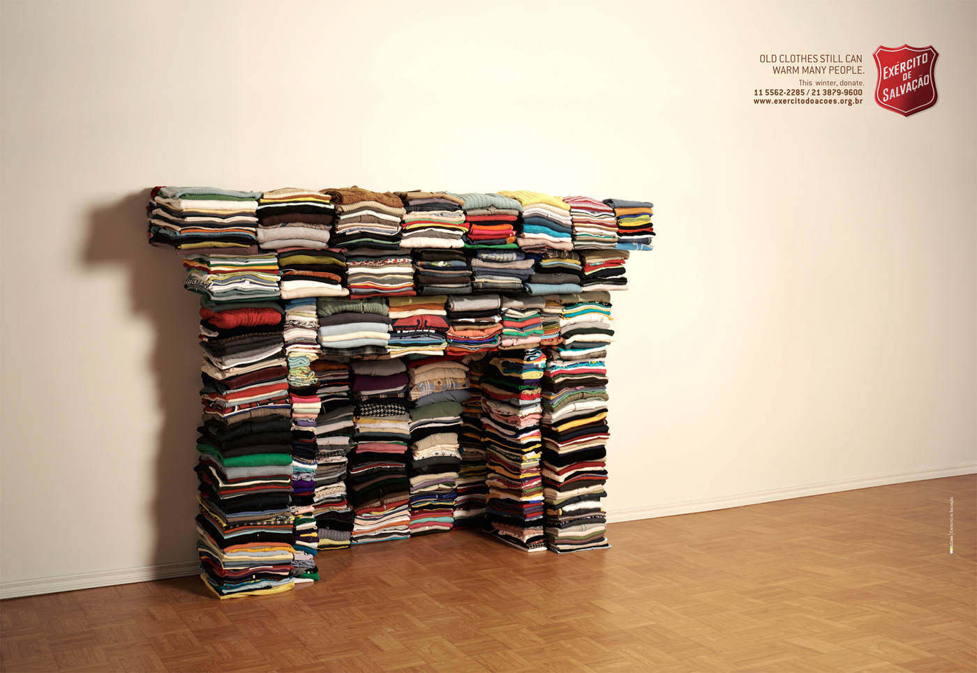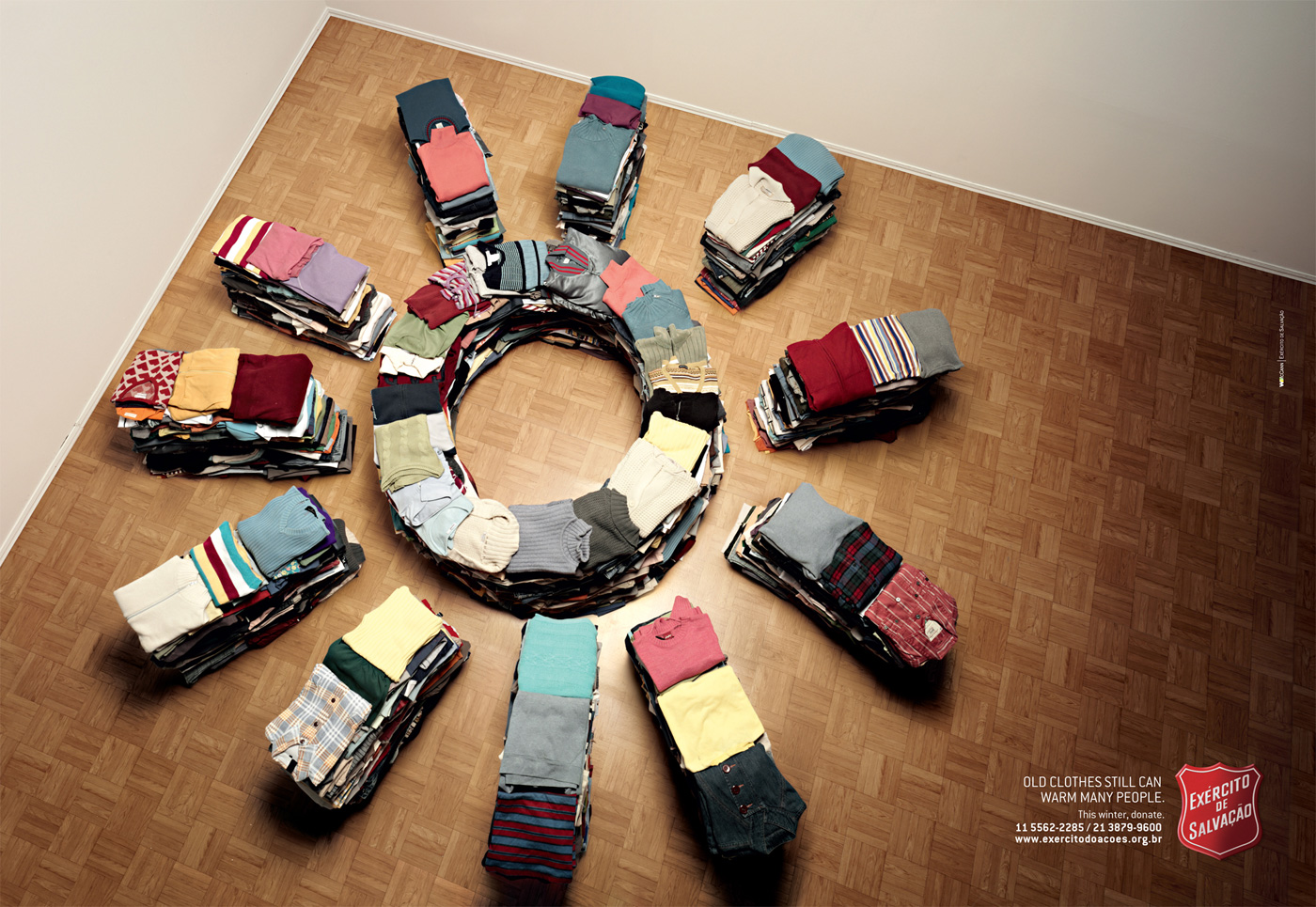 Старые свитера греют не хуже каминаАрмия Спасения призывает пожертвовать старую одежду нуждающимсяБразильское агентство WMcCann создало печатную рекламу для Армии Спасения, одной из крупнейших международных благотворительных организаций, которая существует с 1865 года. Новая кампания направлена на то, чтобы люди не выбрасывали свою старую одежду, а пожертвовали ее нуждающимся, так как она все так же согревает, несмотря на то, что уже вышла из моды. Обыгрывая это, креаторы изобразили камин и стилизованное солнце, сложенные из старых штанов и свитеров. Крайне простое и наглядное решение, совершенно без навязывания, которое зачастую имеется в социальных кампаниях. Состав творческой группы Advertising Agency: WMcCann, Sao Paulo, Brazil Creative Directors: Tales Bahu, Eric Sulzer Art Director: Renato Zandona Copywriter: Rubens Marinelli Photographer: Rafael Costa |