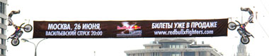 Red Bull X-Fighters выполняют трюки на перетяжкахМосковская Городская Реклама проводит нестандартное размещение перетяжек для бренда Red Bull. 7 из 11 перетяжек изготовлены с использованием экстендеров в виде мотоциклистов, выполняющих трюки.Кампания приурочена к проведению на Васильевском спуске Red Bull X-Fighters 2010 - третьего этапа соревнований по фристайл-мотокроссу. Размещение проходит с 11 по 20 июня в центре города. |