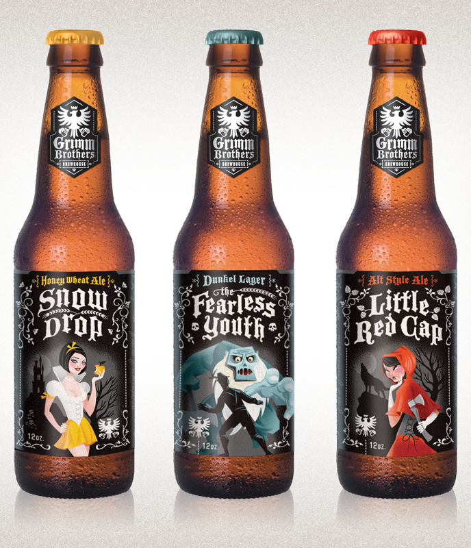 Сказочное пиво братьев ГриммНовое воплощение классических сказок в продукции пивоварни Grimm BrothersВ штате Колорадо открылась новая пивоваренная компания, которая за основу концепции своего бренда взяла всем известные сказки братьев Гримм. Название пивоварни соответствующее - Grimm Brothers Brewhouse. Производство сосредоточено на немецких сортах пива. Каждый из них получил название с аллюзией на оригинальную сказку, но переложенную на иной манер - например Красная шапочка вооружена топором, для защиты от волка. Дизайн этикеток разработан The Tenfold Collective в соответствии с тематикой бренда: