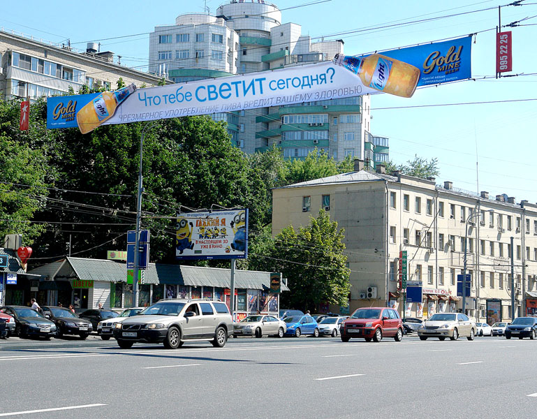 Пиво светит москвичам с перетяжекПо заказу агентства MediaVest для бренда Gold Mine Beer, входящего в портфель пивоваренной компании EFES, Московская Городская Реклама изготовила и разместила перетяжки с использованием экстендеров.Акция проходит в поддержку запуска двух новых сортов пива - Gold Mine Beer Light и Gold Mine Beer Dark. На перетяжке с двух сторон расположены экстендеры в виде пивных бутылок каждого из сортов. Размещение проходит в июле в центре и на основных магистралях столицы. |