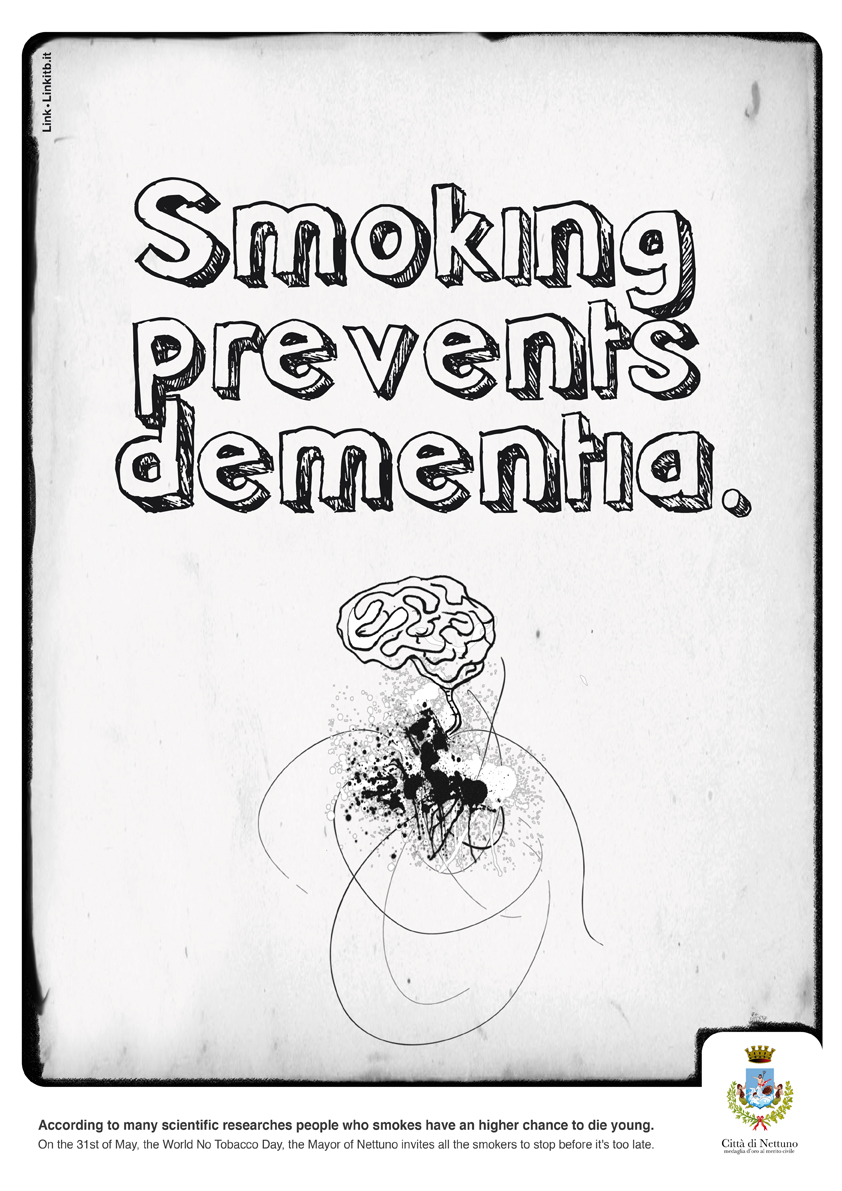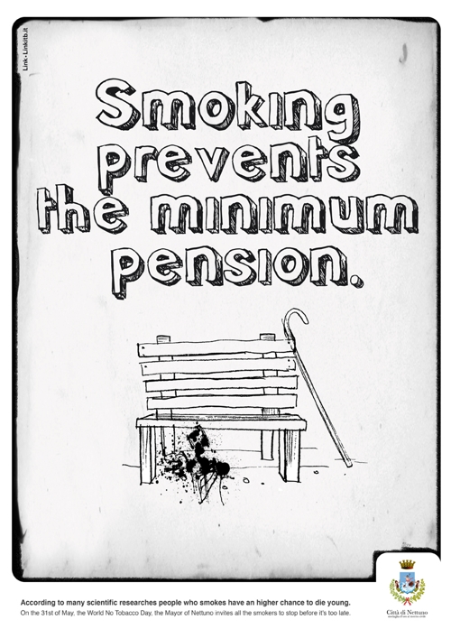 Курильщиков пугают малыми пенсиями и старческим слабоумиемЛокальная антитабачная социальная кампанияитальянского города НеттуноРимское агентство Link разработало печатную кампанию для социальной акции курортного городка Неттуно, стоящего на берегу Тирренского моря. Создатели надеются вразумить курильщиков, продемонстрировав к чему может привести их пагубная привычка. Причем в центре кампании не ужасы раковых заболеваний, а куда более действенные для прагматичных людей образы. Курильщиков пугают тем, что в старости они будут получать худший уход из-за того, что курят сейчас, что их пенсии будут ниже, да вдобавок они рискуют впасть в маразм гораздо больше, чем те, кто ведет здороовый образ жизни. Состав творческой группы Advertising Agency: Link, Rome, Italy Creative Director: Hilde Capra Art Director: Valerio Cicco Copywriter: Saverio Lotierzo Accounts: Francesca Carpineti, Federico Aggio |
