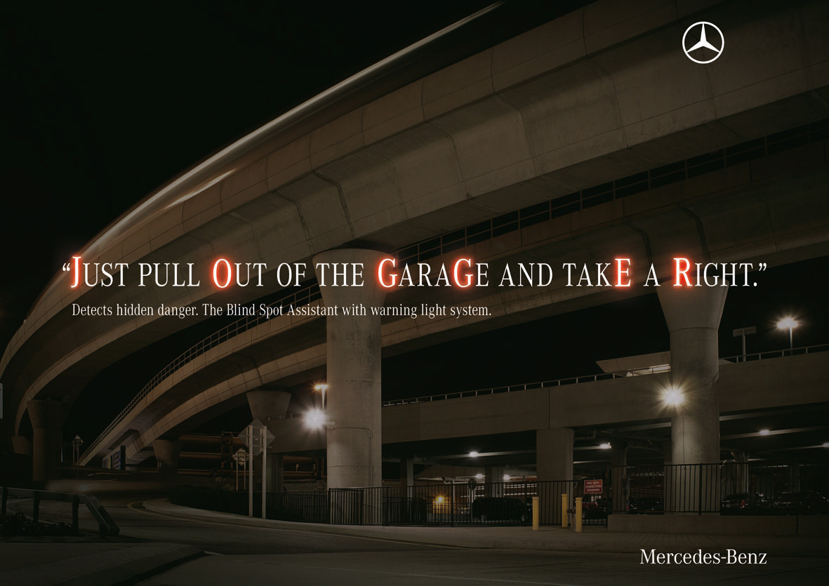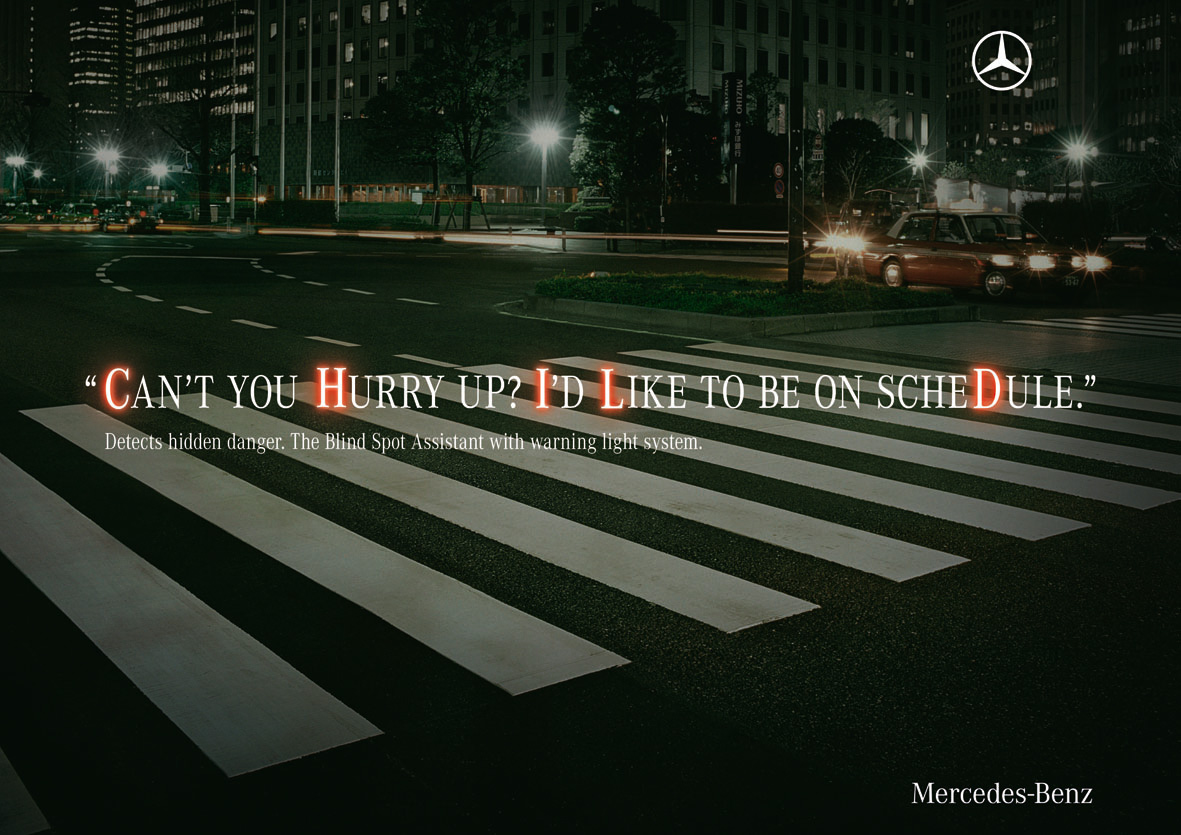 Немецкое BBDO Düsseldorf разработало новую кампанию для своего давнего клиента автоконцерна Mercedes. Серия принтов посвящена ново системе предупреждения скрытых опасностей Blind Spot Assistent, которая сообщает водителю о том, что ждет его впереди и включает предупреждающий сигнал.