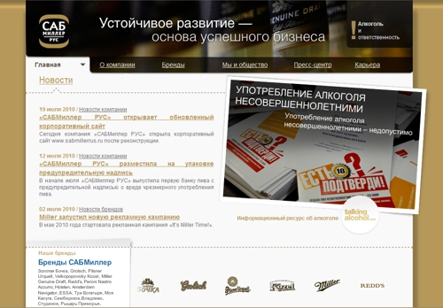 Обновленный сайт "САБМиллер РУС" с уклоном на социальностьКомпания "САБМиллер РУС" открыла корпоративный сайт www.sabmillerrus.ru после реконструкции.В "САБМиллер РУС" считают, что корпоративный сайт - визитная карточка компании, которая есть практически у всех компаний. На первый взгляд все сайты похожи, но в то же время каждый сайт, как и компания, имеет свою индивидуальность. Как рассказали Sostav.ru в компании, здесь уверены, что социальная деятельность компании имеет не менее важное значение для компании, чем финансовые показатели, так как "устойчивое развитие" является основой успешности бизнеса компании. Так что структура нового корпоративного сайта создавалась с целью донести информацию как о компании, ее деятельности, продукции, так и о стратегии и принципах компании в сфере социальной деятельности до широкой аудитории в простой и доступной манере. В качестве дополнительных сервисов на сайте открыты - подписка на новости компании, фотобанк, функция обратной связи и подробная информация о деятельности компании на территории РФ и стран СНГ. ![]() ![]() ![]() |