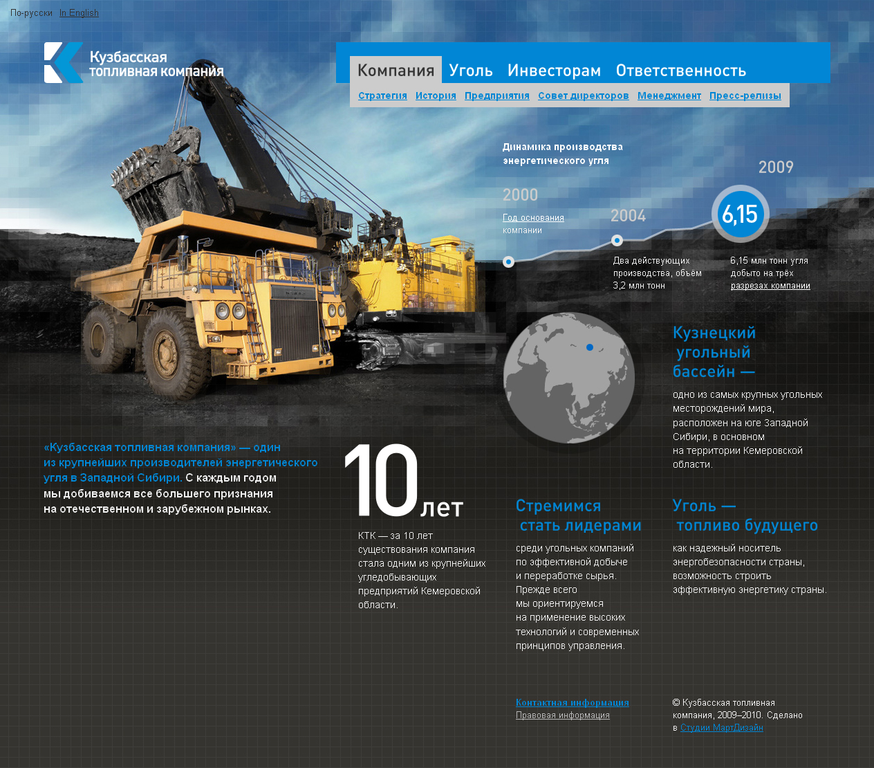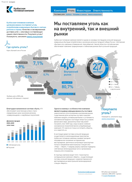 Кузбасский брендингСтудия МартДизайн разработала систему визуальной идентификации и корпоративный сайт Кузбасской топливной компании.Перед "Кузбасской топливной компанией" стояла стратегическая задача - увеличить инвестиционную привлекательность предприятия в рамках подготовки к IPO. Динамичной и прогрессивной компании требовался соответствующий корпоративный сайт. В процессе аудита визуальных коммуникаций компании стало ясно, что фирменный стиль также нуждается в обновлении. В итоге был реализован комплексный проект. Задача, которая стояла перед Студией МартДизайн на первом этапе - создать образ современной, технологичной, стабильной компании, сохранив при этом преемственность существовавшего визуального стиля. В ходе проекта был создан новый фирменный стиль компании и предприятий, входящих в ее состав, разработаны принципы оформления имиджевых и коммуникативных материалов, презентаций, и многое другое. Оригинальный бренд-мотив в сочетании с лаконичным знаком формируют четкую, легко воспринимаемую систему визуальной идентификации. Пиксельная структура и мелкая модульная сетка придают изображениям инновационный и технологичный характер. В рамках второго этапа Студией МартДизайн был спроектирован и разработан корпоративный сайт ОАО "КТК". Логичная и аккуратная организация информации позволяет покупателю, потенциальному инвестору или акционеру легко найти все необходимые данные. |