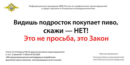 В июле в Москве стартовала информационная программа МВД России против нарушений в сфере торговли в отношении несовершеннолетних. Ее партнером выступил Союз российских пивоваров. «Конечно, в сложном предложении надо ставить запятую, - считает Ольга Козлова, кандидат филологических наук. - Есть первая часть - «видишь», и вторая - «подросток покупает пиво», и их надо отделить друг от друга. Кроме того, предложение нелогичное - кому именно надо сказать «нет»? Себе? Подростку?»