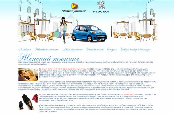 BBDO готово на всё ради "Автоледи"В июле стартовал специальный интернет-проект "Все для автоледи", который предлагает пользователям ознакомиться с автомобилем Peugeot 107, а также получить массу интересной и полезной информации об этом автомобиле и не только о нем. Проект был разработан совместно агентствами Digital BBDO и PHD (входит в OMD MD | PHD Group).Цели проекта: популяризация бренда Peugeot 107, увеличение его узнаваемости, повышение продаж автомобиля. Для реализации кампании были выбраны сайты WMJ+Passion, поскольку сегодня эти площадки являются наиболее популярными у женщин 20 - 35 лет - основной целевой аудитории проекта. С каждым годом все больше женщин садится за руль. После того как права получены, параллельная парковка отработана, самой большой мечтой женщины становится личный автомобиль. Небольшой уютный автомобиль очень удобен для езды в городе. Он подойдет как для начинающих водителей, так и для опытных автоледи. В рамках кампании для Peugeot была создана промо-страница с тематическими материалами, подготовленным специально для этого проекта. Контент готовился с учетом интересов "автоледи" - статьи на автомобильную тематику тесно переплетаются с информацией о модели Peugeot 107, а также интересными сведениями о Франции, что особенно актуально в Год Франции в России. Составляющие проекта: 1. Главная страница (содержит: краткое описание проекта, ссылки на другие разделы, изображения Peugeot 107).