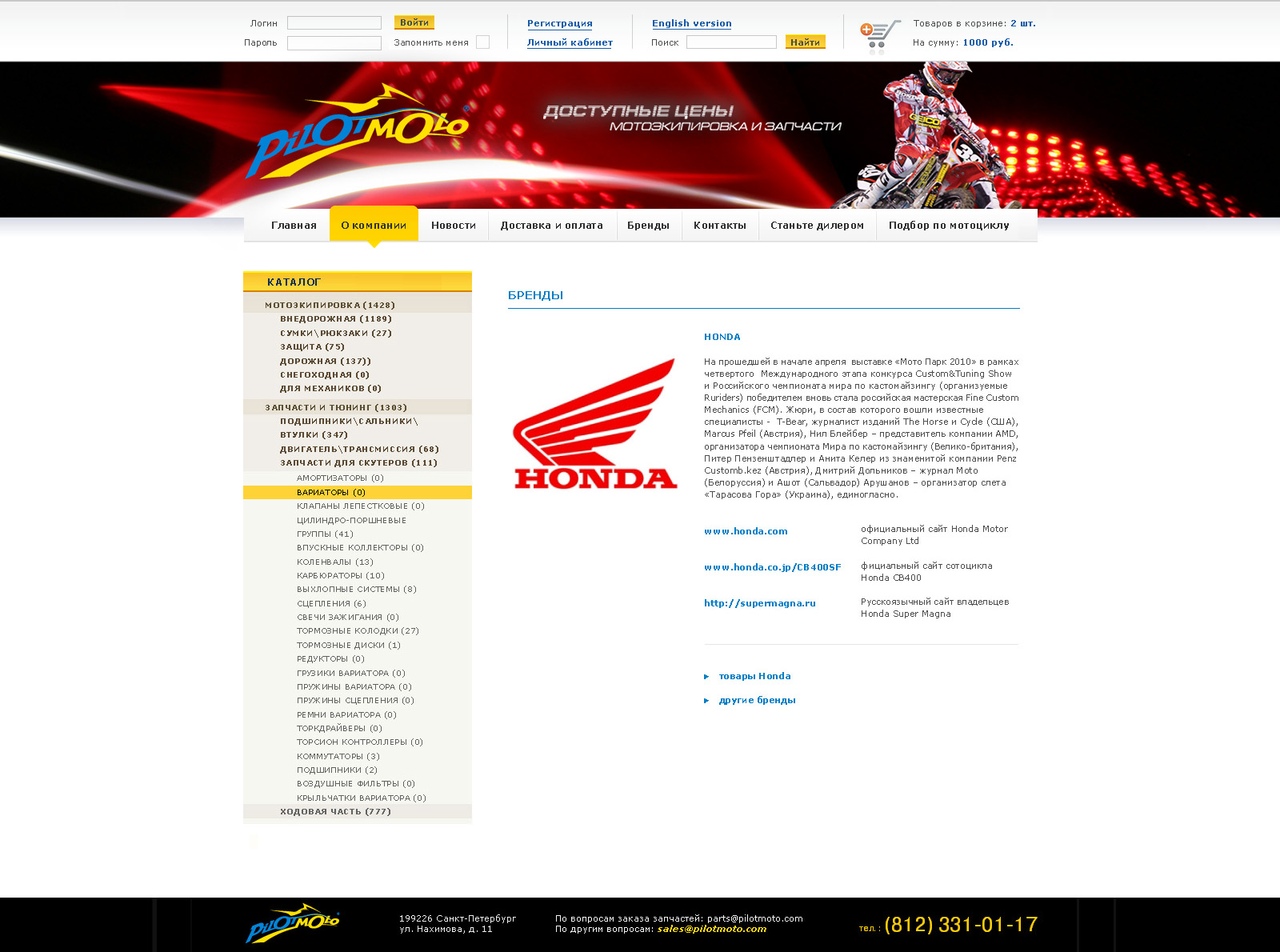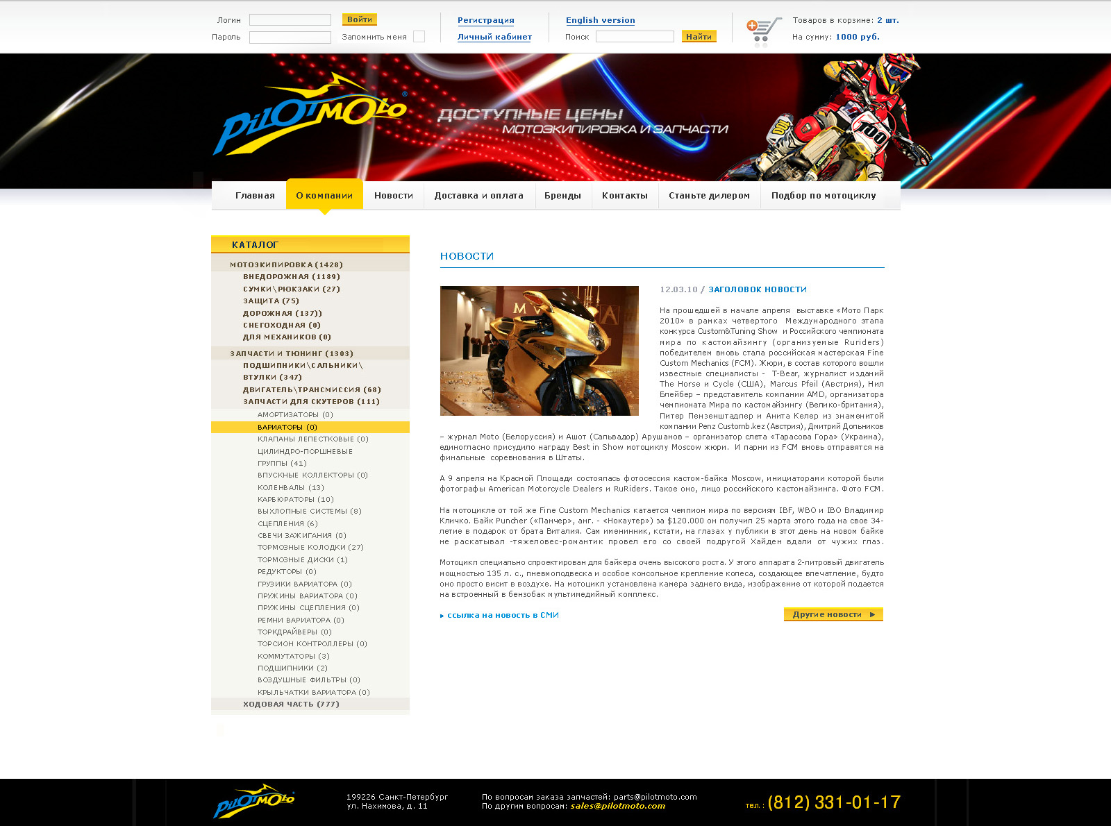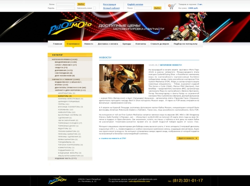 "Икраткое" добавили скорости "Пилот-Мото""Икраткое" завершило работу над созданием дизайна сайта для "Пилот-Мото" - компании, занимающейся продажей аксессуаров и комплектующих для мотокроссового спорта, а так же всем тем, что нужно настоящему любителю мотокросса - начиная от запчастей заканчивая тюнингом и непосредственно самими мотоциклами.Как говорят в агентстве, сайт создан в динамичном, ярком, современном стиле, но в то же время он максимально функционален - ведь он не просто рассказывает потребителям обо всем широком спектре услуг компании, он дает им возможность приобрести необходимый товар через Интернет. Каждая страница сайта оформлена в соответствии со сферой деятельности компании - графика передает то ощущение скорости, динамики, стремительного движения вперед, которое хорошо знает каждый любитель мотокросса и без которого не смыслит своего существования. Визуальные образы, представленные в поддержку данной концепции - мотоциклисты, летящие вперед и оставляющие за собой яркие огни трассы, - поддерживают и усиливают это ощущение. Ранее "Икраткое" уже разработало для "Пилот-Мото" логотип, так же воплощающий особенности этой компании - постоянное, неудержимое стремление вперед, запредельные скорости и настоящий дух свободы, знакомые любому, кто хоть раз садился за руль мотоцикла. Состав творческой группы: Креативный директор: Никита Рубцов Дизайнер: Петр Кузнецов |