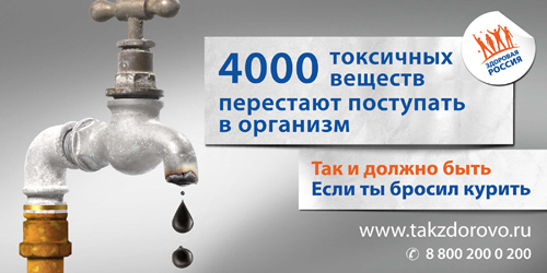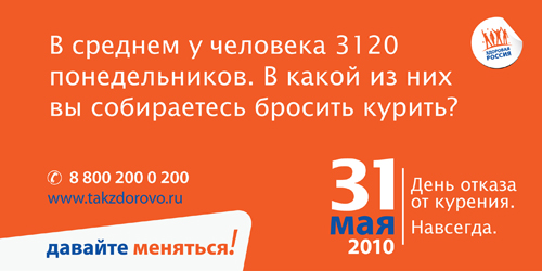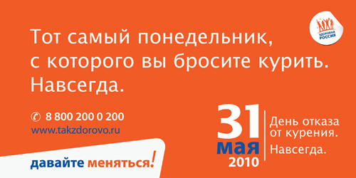 Кампания "Давайте меняться!" охватывает РоссиюМинздравсоцразвития России запустило антитабачную социальную рекламную кампанию "Давайте меняться!", направленную на мотивирование населения России к отказу от курения и ведение здорового образа жизни без сигареты.В рамках кампании также создан Клуб никотиновой НЕзависимости "31 мая", размещенный на Интернет-портале о здоровом образе жизни www.takzdorovo.ru. Этот клуб вырос из сетевого ресурса, который был запущен к акции "31 мая - день отказа от курения. Навсегда", проводившейся Минздравсоцразвития России в этом году. На портале помимо материалов о рисках, связанных с употреблением табака, рекомендациям, как бросить курить, и методам отказа от курения, можно скачать специально разработанную программу для установки на рабочий стол компьютера, которая окажет помощь в процессе отказа от курения. Здесь же можно посмотреть анимационные ролики и другие видеоматериалы. Давайте меняться! Колизей Давайте меняться! Аист Давайте меняться! Труд Давайте меняться! Не обманывай себя! Давайте меняться! Закон 23 Давайте меняться! Закон 14 Давайте меняться! Закон 10 Давайте меняться! Закон 8 Рекламная кампания является частью комплексной коммуникационной кампании "Здоровая Россия", которую проводит Минздравсоцразвития России в направлении формирования приоритетов здорового образа жизни. Общий слоган всей кампании - сообщение "Давайте меняться!", предлагающее поменять отношение к себе, своему здоровью, взглянуть по-другому на свой образ жизни. Рекламная кампания проходит в следующих форматах: телевидение, наружная реклама, радио, Интернет. Так, на ТВ идет ролик "Танец" о том, как чувствует себя человек, который бросил курить. Коммуникационную стратегию и креативную концепцию кампании разработало Агентство маркетинговых коммуникаций Znamenka. Состав творческой группы: Минздравсоцразвития России: Руководитель: София Малявина Артем Коротков, Агнета Красильщикова, Ольга Коробейникова, Оксана Свинцова Агентство: АМК Znamenka Креативный директор: Руслана Харитонова Руководитель творческой группы: Максим Севастьянов Копирайтер: Антон Фурсов Арт-директор: Алик Мамедов Дизайнеры: Дмитрий Гребнев, Евгения Федотова Директор по развитию: Алла Коцюба Менеджеры: Екатерина Соляникова, Дарья Чернова Стратеги: Галина Теорина, Юлия Лоскутова Продюсеры: Юрий Алексеенко, Галина Антипина Продакшен Хаус: Базелевс CO-Продакшен: Lime Lite Studio Ukraine Режиссер: Алексей Тишкин Оператор: Евгений Ермоленко Продюсер: Медея Карашева Анимационная студия: Флэшпром Художник-аниматор: Илья Никитин Digital Production: Адверт.ру (программа для установки на рабочий стол, интернет-баннеры) Руководитель отдела креативных решений: Кирилл Жуков Арт-директор: Арсений Сычев Иллюстратор: Кирилл Клочков Копирайтер: Максим Белов Разработчики: Андрей Синицын, Антон Борицкий, Антон Михайлов Веб-мастер: Александр Кувшинов Аккаунт директор: Юля Шпилевая |