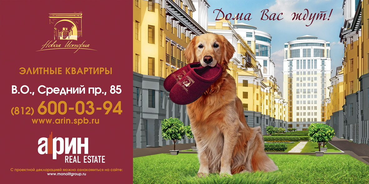 "Новая История" от "Икраткого"Рекламное агентство "Икраткое" завершило работу над созданием имиджевого банера 3x6 и буклета для продвижения нового элитного жилого комплекса "Новая История", расположенного на Васильевском острове.Основной задачей агентства было отобразить не только элитарность жилья "Новой истории", но и тот факт, что сам комплекс и по расположению, и по внутренней инфраструктуре соответствует самому высокому уровню и стандартам. Близость к историческому центру города, передовые охранные технологии, инженерное наполнение, планировка квартир - вот, что было необходимо отобразить в банере и буклете. В качестве основного послания потенциальным клиентам был выбран слоган "Дома вас ждут!" подкрепленный образами ухоженных, породистых домашних питомцев, ожидающих дома возвращения хозяев. Эти образы призваны, по мнению дизайнеров, ассоциироваться у будущих жильцов с уютом, безопасностью и той особой атмосферой, которая делает квартиру настоящим домом. Состав творческой группы: Креативный директор: Никита Рубцов Дизайнер: Наталья Иванова Дизайнер: Петр Кузнецов |