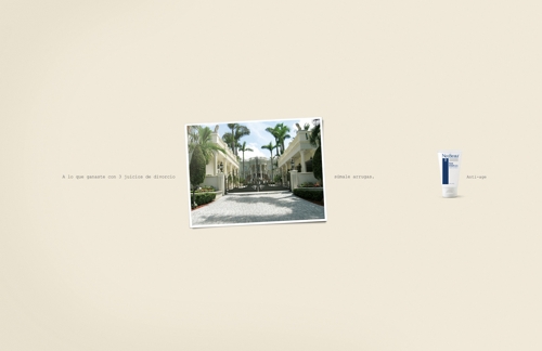 По мнению рекламистов в первую очередь в появлении морщин виноват не возраст, а негативные факторы, такие как усталость и нервное напряжение. Чтобы изобразить эту концепцию креаторы использовали символы, означающие успех и процветание: диплом престижного университета, яхту и виллу, но при этом подписи к картинкам имеют совсем иное значение: