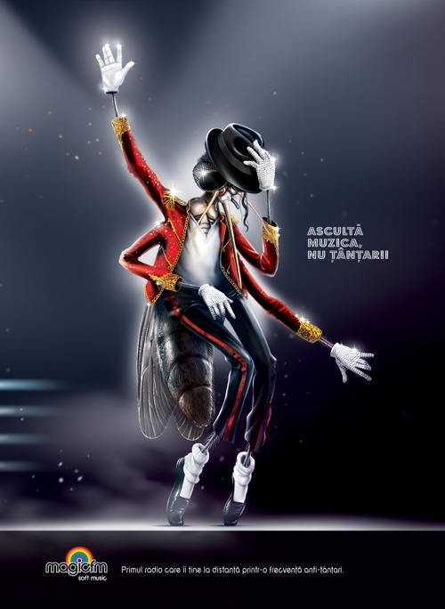 Майкл Джексон стал комаромРеклама радио, которое отпугивает насекомыхРумынское радио Magic Fm обладает необычайным свойством - оно вещает на такой частоте, которая отпугивает комаров. По этой причине агентство Graffiti BBDO Bucharest обратилось к образу умершего в прошлом году Майкла Джексона, изобразив в его облике комара. Хотя и не совсем понятно, как изображение комара-музыканта подчеркивает слоган "Слушайте музыку, а не комаров". Состав творческой группы Advertising Agency: Graffiti BBDO Bucharest, Romania Creative Director: Mihai Gongu Art Director: Ioana Avram Copywriter: Ana-Maria Taralunga Illustrator: Fesus Barna |