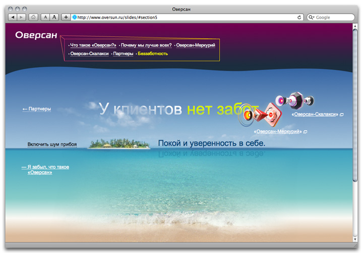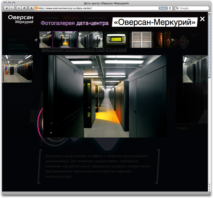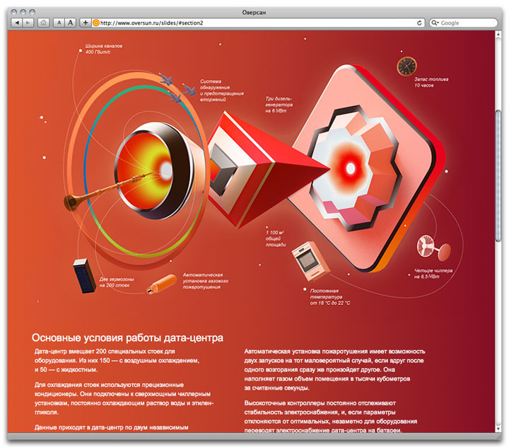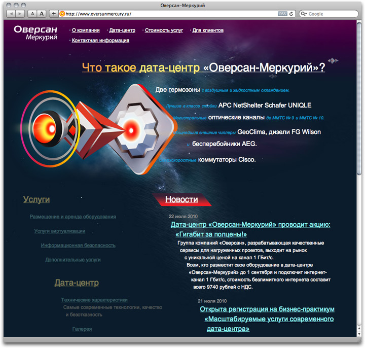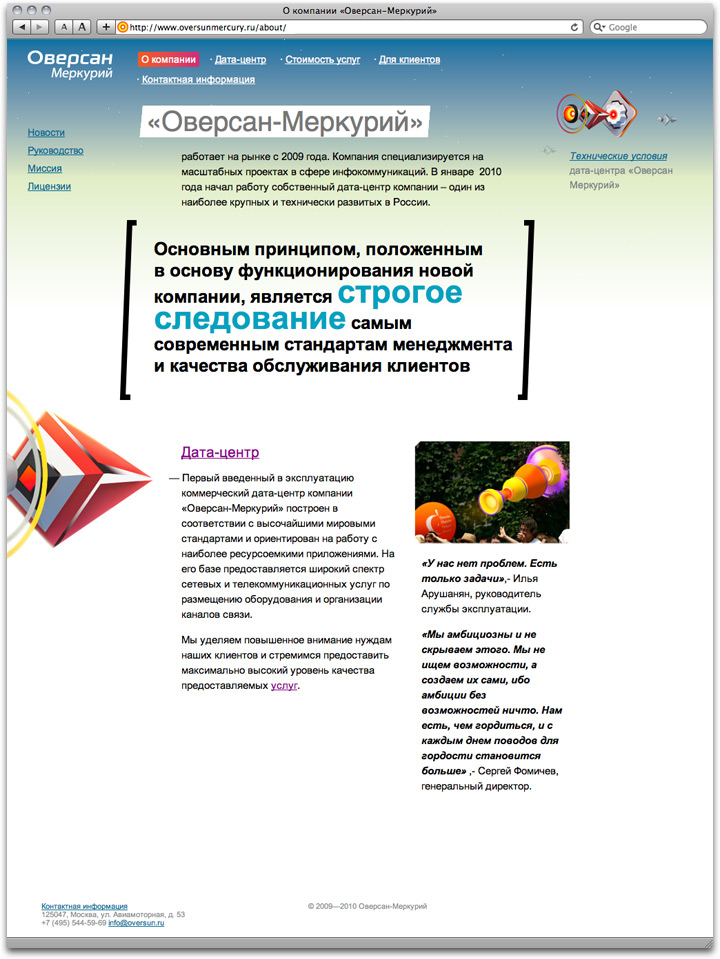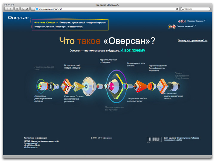 "Оверсан" "телепортировался" в ИнтернетВ Студии Лебедева разработали сайт для компании "Оверсан". Как рассказывают в Студии , на шести страницах сайта посетитель получает общее представление о компании, ее миссии и партнерах, узнает про облачные вычисления "Оверсан-Скалакси" и дата-центр «Оверсан-Меркурий». За подробностями следует телепортироваться на сайты-спутники сервисов.Напомним, что Студии принадлежит разработка логотипа и фирменного стиля для "Оверсана". Также в Студии создан сайт для одного из первых дата-центров разворачивающейся системы "Оверсана". Он содержит информацию о расценках на услуги и о том, как работает компания. Состав творческой группы (сайт "Оверсан-Скалакси") арт-директор - Людвиг Быстроновский, дизайнер - Василий Сергеев, технический директор - Андрей Лечев, технологи - Максим Никитин, Игорь Алексеенко, Владислав Яковлев, редактор - Сергей Рублев, менеджер - Алексей Лури. Состав творческой группы (сайт даты-центра) арт-директор - Людвиг Быстроновский, дизайнер и фотограф - Василий Сергеев, технический директор - Андрей Лечев, технологи - Максим Шипко, Антон Лисенко, Ярослав Жук, Евгений Лепешкин, Максим Никитин, редактор - Сергей Рублев, менеджер - Алексей Лури |