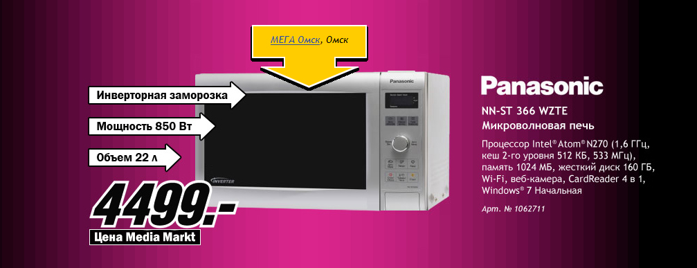 Досадную ошибку приняли за "вирусную кампанию" для PanasonicНа сайте сети магазинов бытовой техники и электроники Media Markt появилась интересная страничка, которая многими в Интернете была воспринята как вирусная реклама компании Panasonic. В частности, информация об этом появилась на ресурсе ХабрХабр.Рядом с фотографией микроволновой печи Panasonic модели NN-ST 366 WZTE разместилось описание "Процесс Intel Atom N270 (1,6 ГГц), кеш 2-го уровня 512 КБ, 533 МГц". Как рассказали Sostav.ru в Media Markte, речи о вирусной кампании не идет. Просто произошла досадная ошибка, из-за которой описание для ноутбуков оказалось рядом с фотографией микроволновой печи. |