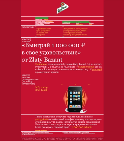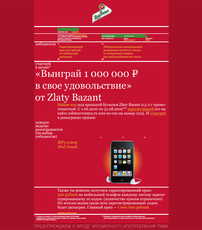 Pichesky Digital развлекают посетителей сайта Zlaty BazantВ 2010 году компания Heineken и агентство Pichesky Digital продолжают сотрудничество по разработке digital-активностей для бренда Zlaty Bazant.В начале года агентство Pichesky Digital провело рестайлинг долгосрочной online-платформы бренда zolotoevremya.ru, учитывая определение новых задач, которые должен решать ресурс в этом году, и предыдущий опыт взаимодействия с аудиторией. Основой рекламной кампании Zlaty Bazant стали "персональные моменты удовольствия", которые, как известно, у всех разные. В задачи агентства входило показать те самые моменты удовольствия, "достучаться" до каждого через различные digital-активности как на сайте, так и за его пределами. В числе разработанных специалистами Pichesky Digital-активностей - промостраница в поддержку акции "Выиграй 1 000 000 рублей в свое удовольствие", online-журнал "В свое удовольствие", уникальный фототест и промоприложение "Вконтакте". Промоакция "Выиграй 1 000 000 рублей в свое удовольствие" проходила все лето. В поддержку акции была разработана промостраница www.zolotoevremya.ru/promo, на которой пользователи могли узнать о призовом фонде и правилах акции. С помощью журнала "В свое удовольствие" креативный отдел Pichesky решил одну из главных задач - создать определенные "клише" удовольствий, рассказать о том, что именно может доставлять это удовольствие. Журнал выходит ежемесячно, учитывает многообразие интересов и увлечений аудитории и содержит множество рубрик. Это полноценное online-издание, уже имеющее свою нишу и завоевавшее своих преданных читателей. Как говорят в агентстве, портал www.zolotoevremya.ru является полноценной и долгосрочной online-площадкой для продвижения Zlaty Bazant, состоящей из компиляции интересного контента и социальной сети (после регистрации на сайте пользователю открывается широкий функционал социальной сети, посвященной увлечениям и хобби). Благодаря регулярным промоактивностям за время существования его постоянными пользователями стали более 55 000 человек. Состав творческой группы: Pichesky Digital: Арт-директор - Константин Обухов Руководитель команды разработки - Александр Трифонов Менеджер - Наталия Кавицкая Разработка приложения Вконтакте - Orange Games Со стороны клиента: Оксана Кищенко |