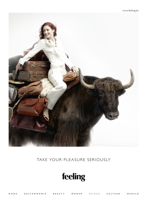Журнал Feeling призывает поедать живых осьминогов и купаться в шоколадеПечатная кампания бельгийского глянцевого журналаНовая рекламная кампания бельгийского Feeling Magazine призывает читателей серьезно взяться за свое удовольствие. Серия принтов, разработанных агентством Happiness Brussels, отражает несколько основных тематических направлений журнала, таких как путешествия, гастрономия, красота и культура. В рекламе они представлены довольно необычным и забавным образом: например, путешествовать предлагается верхом на буйволах, а красоту наводить с помощью шоколадной ванны. Таким образом рекламисты отражают концепцию журнала, который считает, что, только получая удовольствия по полной программе, можно быть действительно счастливым. Состав творческой группы Advertising Agency: Happiness Brussels, Brussels, Belgium Creative Management: Karen Corrigan, Gregory Titeca Creative Director: Gregory Titeca Account Management: Inez De Pooter, Vanessa Boddewyn Concept Providers: Naim Baddich, Patrick Glorieux, Philip Vandenberghe Head of Copy: Philip Vandenberghe Head of Art: Cecilia Azcarate Producer: Caroline Marson Photography: Christophe Gilbert |