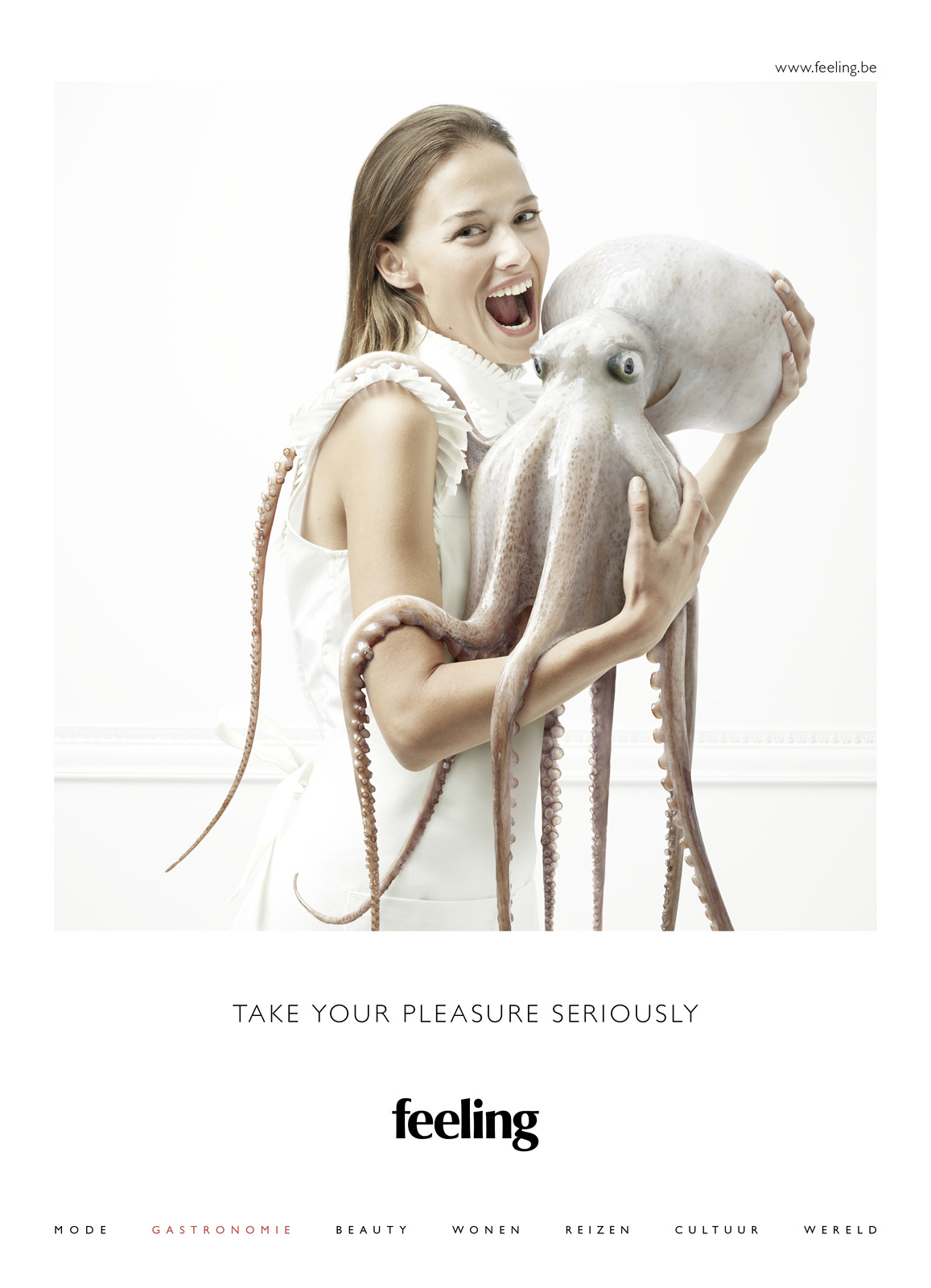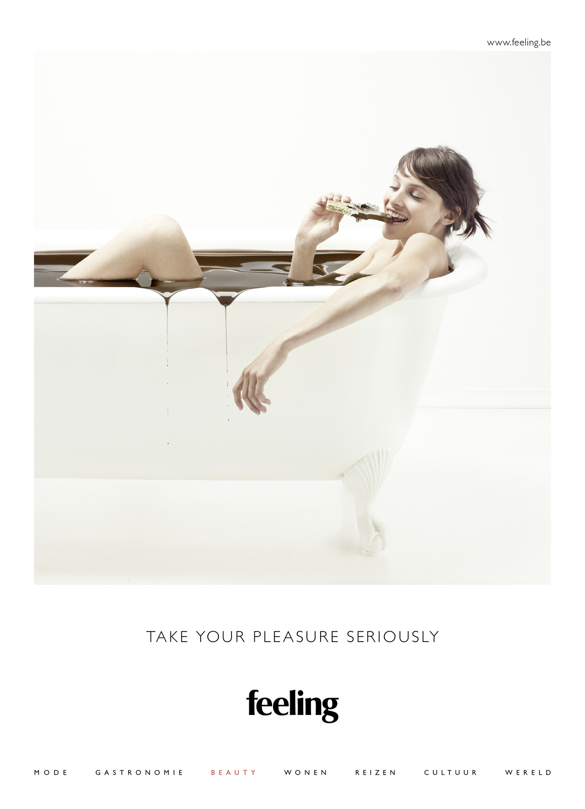 Журнал Feeling призывает поедать живых осьминогов и купаться в шоколадеПечатная кампания бельгийского глянцевого журналаНовая рекламная кампания бельгийского Feeling Magazine призывает читателей серьезно взяться за свое удовольствие. Серия принтов, разработанных агентством Happiness Brussels, отражает несколько основных тематических направлений журнала, таких как путешествия, гастрономия, красота и культура. В рекламе они представлены довольно необычным и забавным образом: например, путешествовать предлагается верхом на буйволах, а красоту наводить с помощью шоколадной ванны. Таким образом рекламисты отражают концепцию журнала, который считает, что, только получая удовольствия по полной программе, можно быть действительно счастливым. Состав творческой группы Advertising Agency: Happiness Brussels, Brussels, Belgium Creative Management: Karen Corrigan, Gregory Titeca Creative Director: Gregory Titeca Account Management: Inez De Pooter, Vanessa Boddewyn Concept Providers: Naim Baddich, Patrick Glorieux, Philip Vandenberghe Head of Copy: Philip Vandenberghe Head of Art: Cecilia Azcarate Producer: Caroline Marson Photography: Christophe Gilbert |