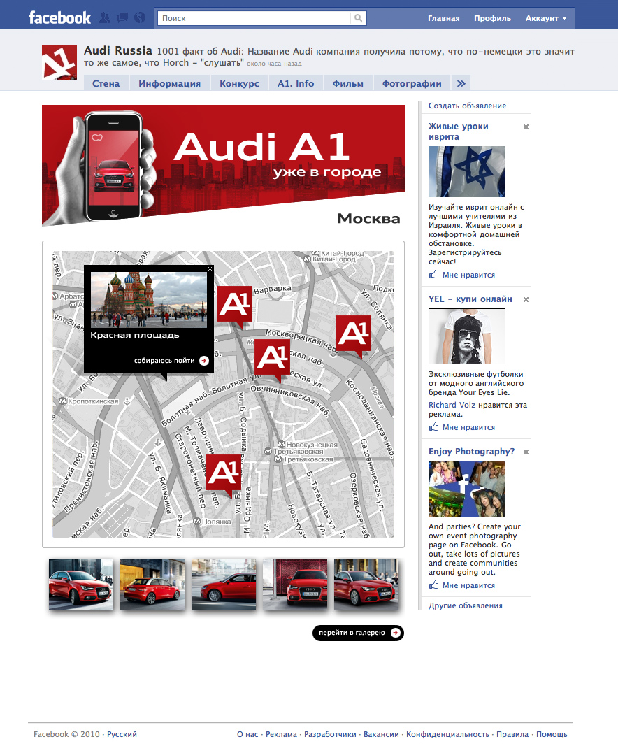 Audi A1 в "дополненной реальности" уже в городе и в СетиНа странице Audi Russia в Facebook стартовал интерактивный конкурс «Audi A1 уже в городе». Участникам предлагается найти и сфотографировать Audi A1 на улицах российских городов - при помощи мобильного телефона и сервиса добавленной реальности Layar. Креативное агентство «Родная речь», разрабатывающее кампанию по запуску A1 в России, предложило использовать Layar в продвижении нового автомобиля и придумало конкурс.Сервис Layar появился в Голландии в 2009 году. Layar предлагает получать дополнительную информацию об окружающем мире, накладывая её в реальном времени на изображение с камеры мобильного телефона. Теперь можно навести камеру мобильного телефона на хорошо знакомый объект или здание - и тут в кадре появляется новый Audi A1, реалистично вписанный в городской пейзаж. Теперь можно навести камеру мобильного телефона на хорошо знакомый объект или здание - и тут в кадре появляется новый Audi A1, реалистично вписанный в городской пейзаж. Первыми увидеть новый стильный Audi на знакомых улицах могут участники конкурса "Audi A1 уже в городе", стартовавшего на странице автомобиля в сети Facebook по адресу. Для участия необходим эккаунт в Faсеbook и мобильный коммуникатор с GPS, камерой и датчиком движения, работающий под управлением системы iPhone OS или Android. Здесь предлагается скачать и установить на устройство браузер добавленной реальности Layar - и можно отправляться на поиски Audi A1. Карта точек, где может появиться виртуальный автомобиль, доступна по ссылке на странице конкурса. В игре участвуют Москва, Санкт-Петербург, Казань, Екатеринбург и Нижний Новгород. Авторов лучших работ ждут ценные призы от Audi.